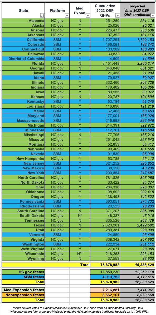 Finally, here's my projection of what the final 2023 OEP QHP numbers should look like, assuming the final week/2-week enrollment bumps are similar to what they looked like during the 2022 OEP for each state. Assuming an identical OEP wrap-up, the national QHP total should come in just shy of 16.4 million people: