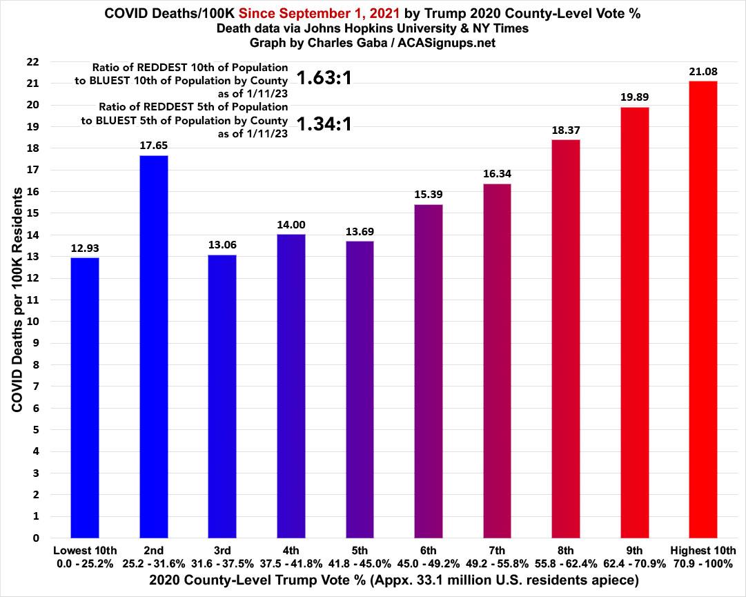 In terms of the partisan divide, this has indeed also shrunk dramatically, with the death rate since September 1st down to just 63% higher (vs. 84% higher last month) in the reddest tenth of the country compared to the bluest tenth. In addition, there's a significant bump in the 2nd-bluest decile (which includes major urban cities like Los Angeles, Queens and Detroit); if you were to compare the reddest fifth of the U.S. vs. the bluest fifth, it would be more like a 1.34:1 ratio: