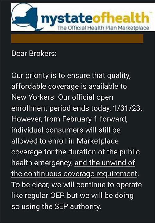 NY State of Health has recently sent out an e-mail to brokers appointed with the marketplace, confirming that the SEP due to the COVID Public Health Emergency will continue.