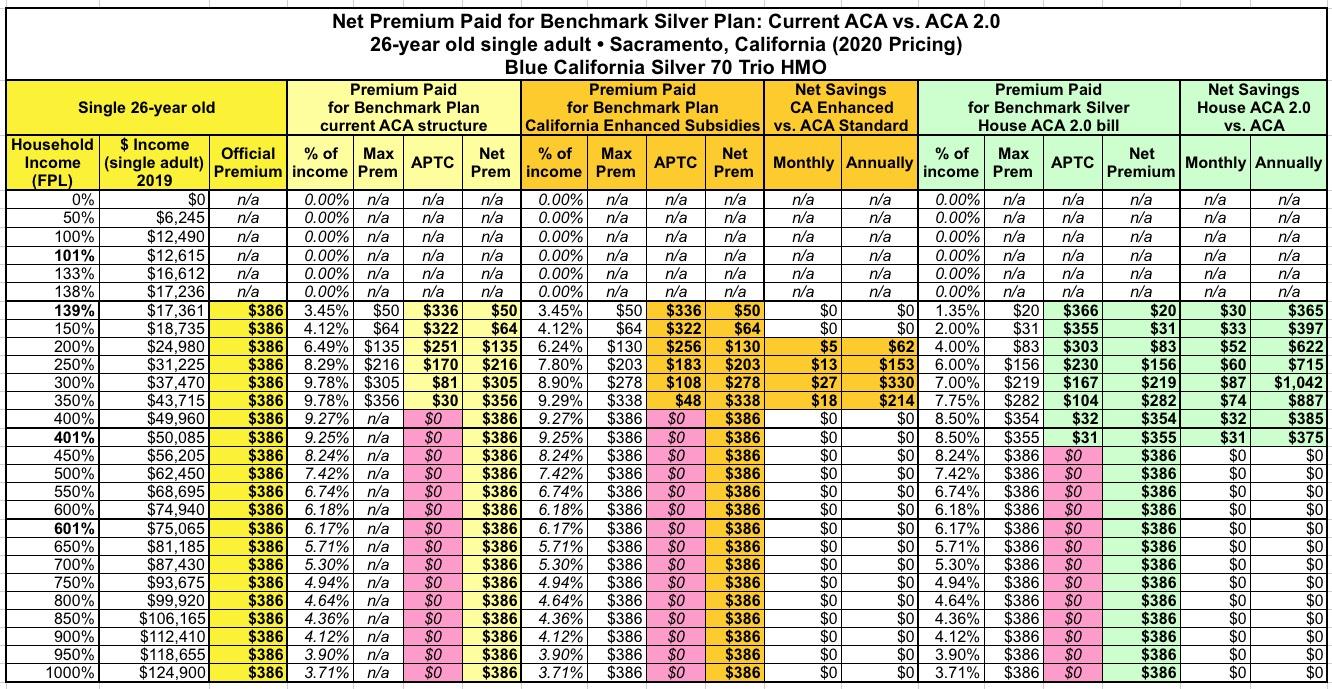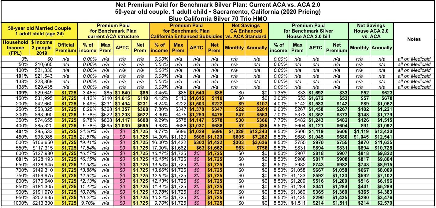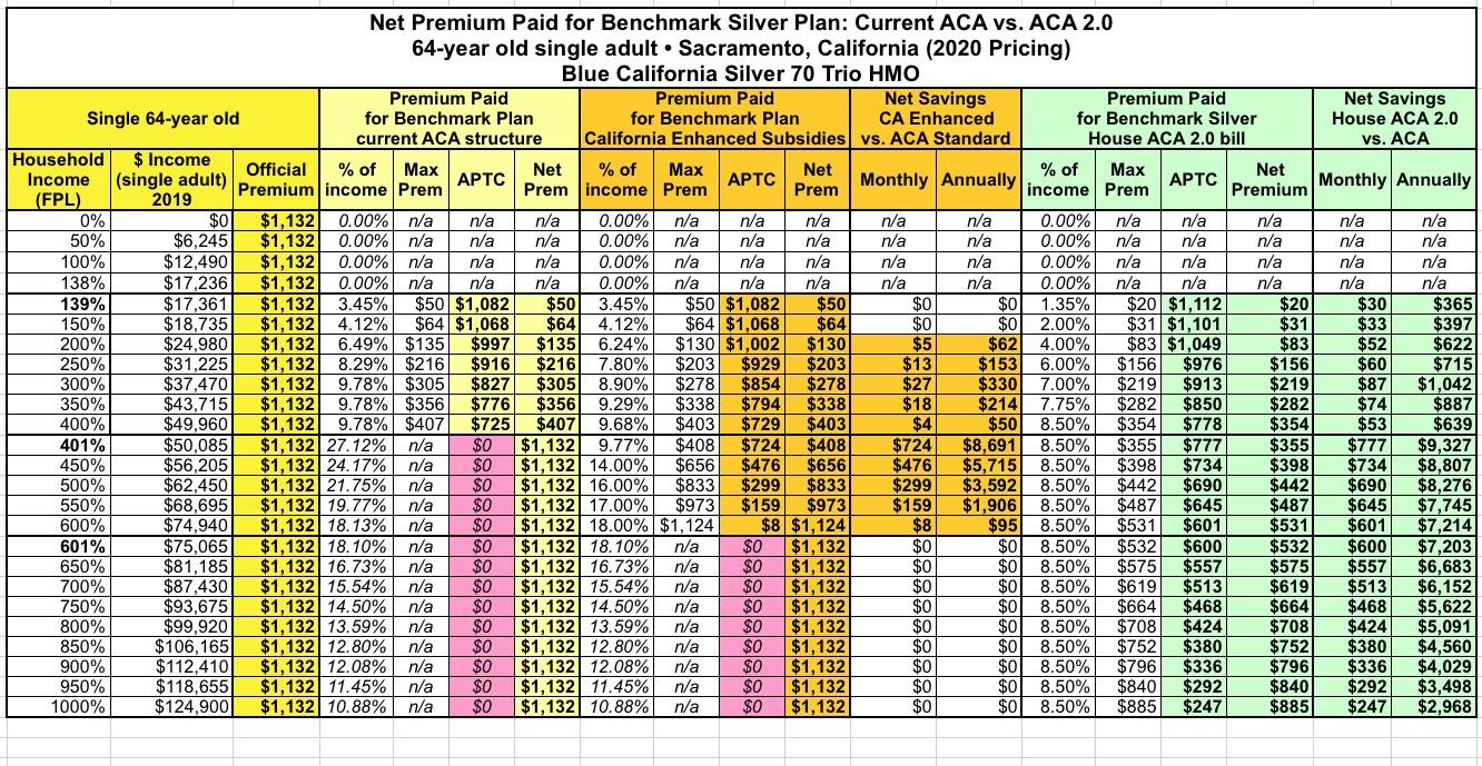 I've also included a third overlay on the tables below: The federal House Democrats ACA 2.0 bill (either H.R. 1868 or H.R. 1884), which would cap premiums at no more than 8.5% of income. The official ACA formula is in Orange; the California subsidy formula is in Blue, and the proposed ACA 2.0 structure is in Green.