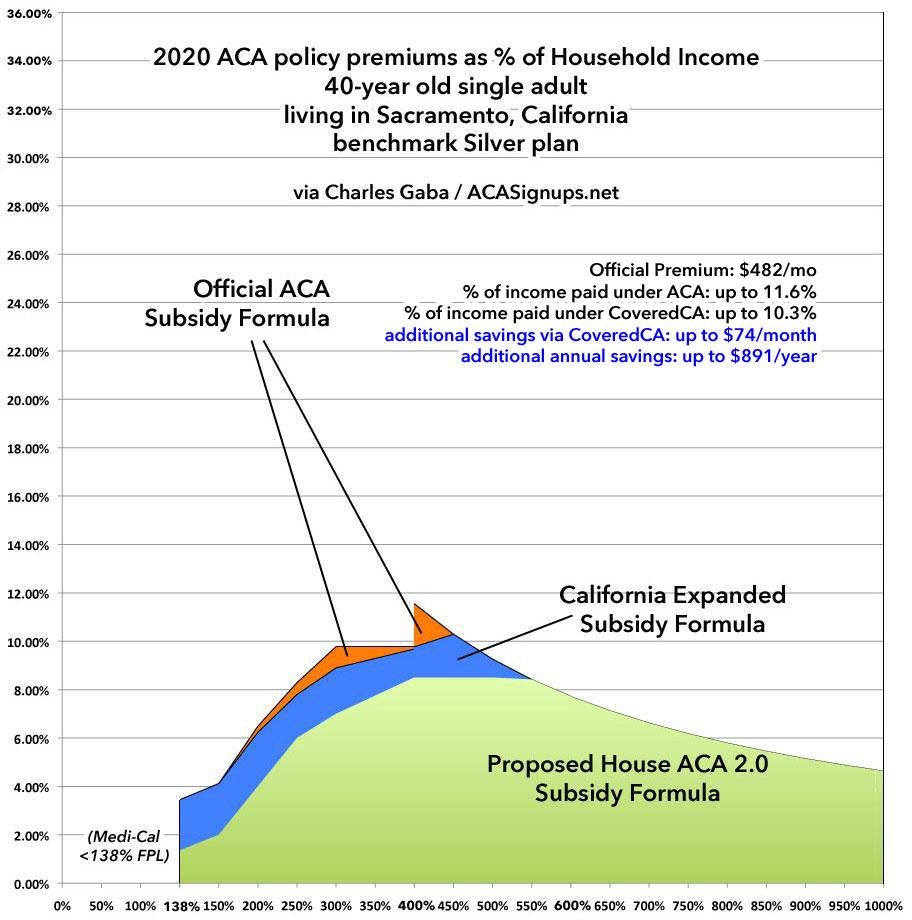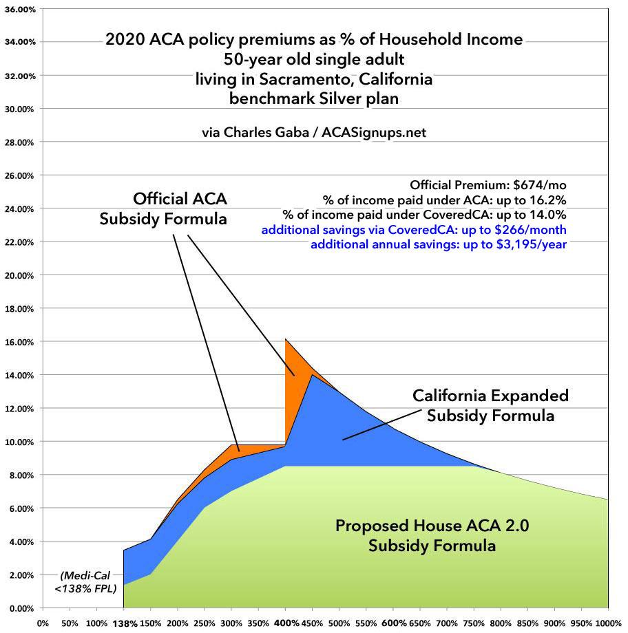 IMPORTANT: As I've noted before, Covered California has arranged to expand and enhance their ACA premium subsidies beyond the official ACA formula starting with the 2020 Open Enrollment Period. Back in October, I posted a detailed analysis, complete with tables and graphs to explain just how much hundreds of thousands of Californians could save under the new, beefed-up subsidy structure.