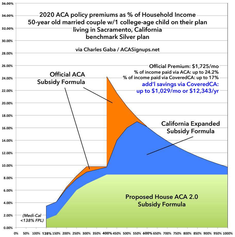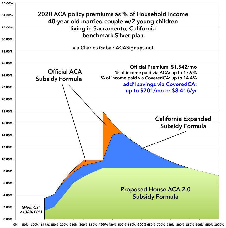 Under the official ACA structure, the total cost for both would be limited to no more than between $103 - $839/month between 138 - 400% FPL...after which it would immediately jump to the full $1,542/mo, or over $18,500/year. Under California's expanded subsidies, however, they'd receive additional savings of as much as $680/year between 250 - 400% FPL...and as much as $8,400 between 400-600%.