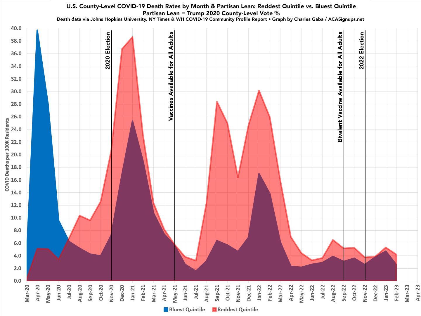 ...There is evidence that Republican-leaning counties have had higher COVID-19 death rates than Democratic-leaning counties and similar evidence of an association between political party affiliation and attitudes regarding COVID-19 vaccination; further data on these rates may be useful.