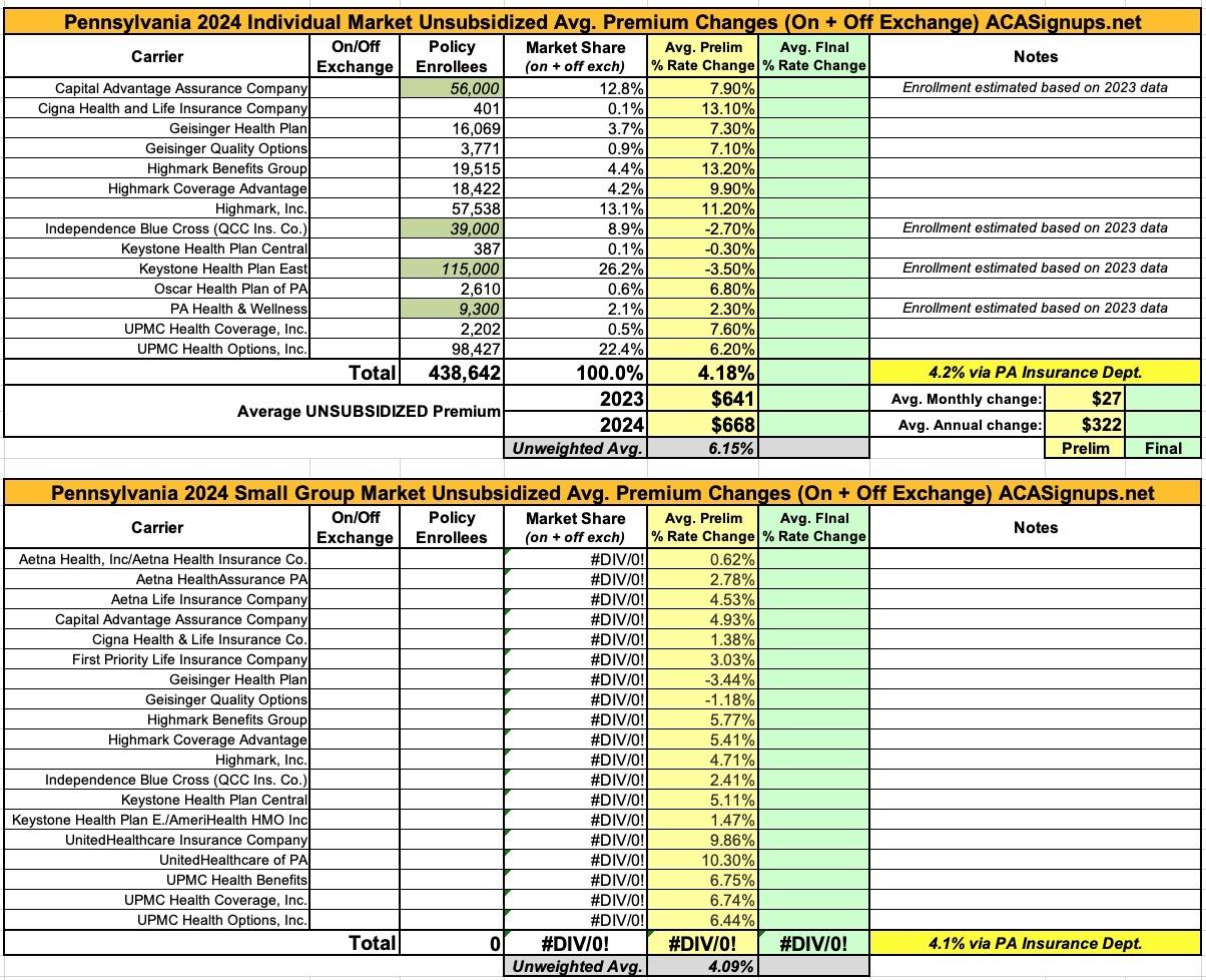 Pennsylvania: Preliminary avg. unsubsidized 2024 #ACA rate changes: +4.2%