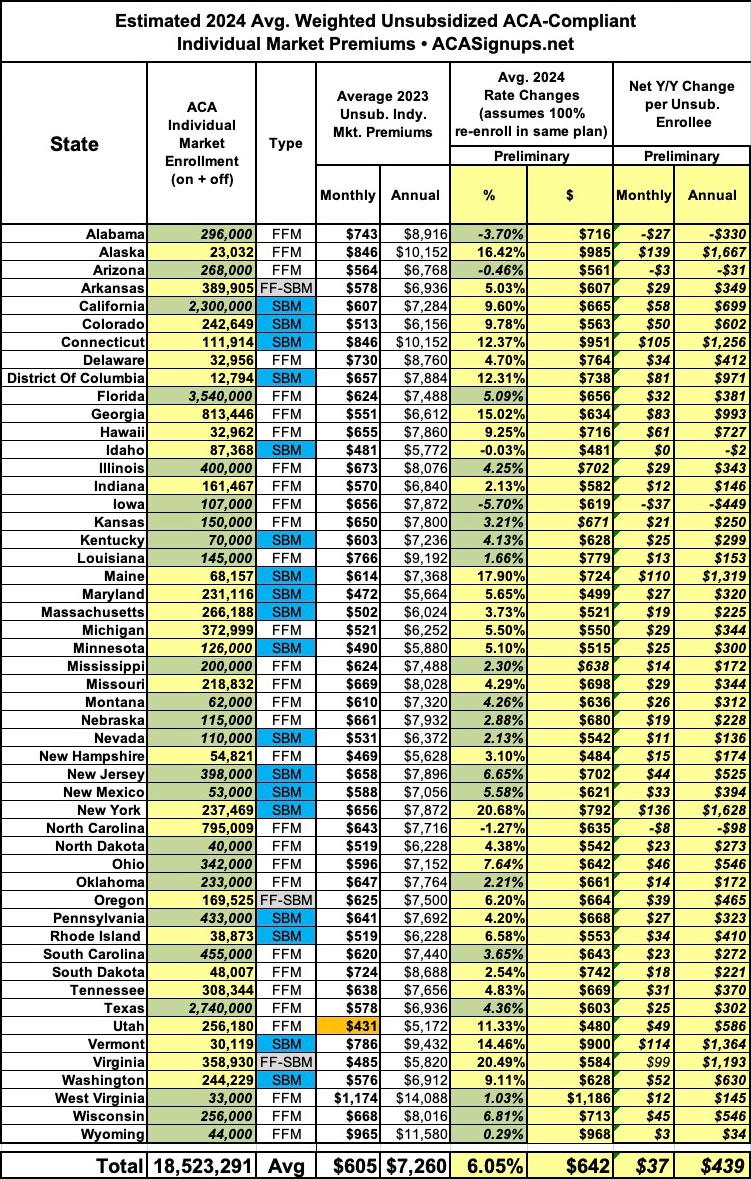EVERY STATE: Preliminary avg. unsubsidized 2024 #ACA rate changes: +6.1% (semi-weighted)