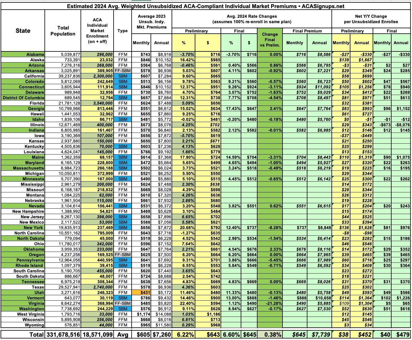 FINAL unsubsidized 2024 premiums: +6.6% across 26 states