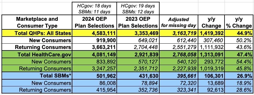 Earlier today I posted the initial above-the-fold numbers for the 2024 ACA Open Enrollment Period as reported by the Centers for Medicare & Medicaid Services (CMS):