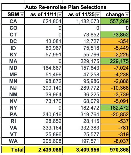 CMS has also provided the actual state by state breakout, which also includes a bunch of additional data....including auto-renewals for the state-based exchanges only (the federal exchange auto-renewals aren't added to the reports until after the first enrollment deadline on December 15th):