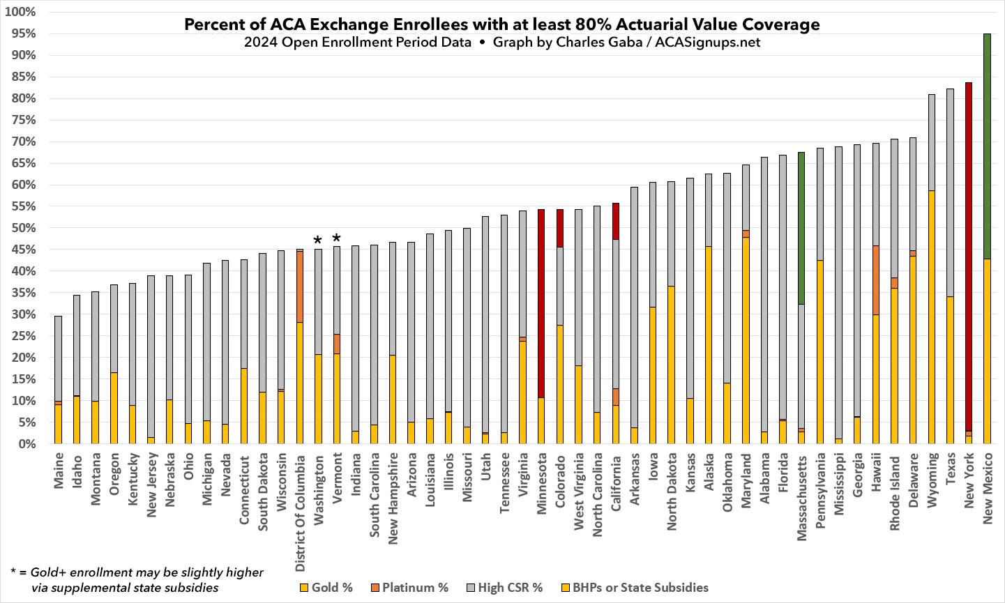 As for Vermont and Washington's supplemental subsidy programs, they mostly apply to premiums, not cost sharing, so while their Gold-or-Better numbers are likely slightly higher, I don't think it's more than a percent or two at most.