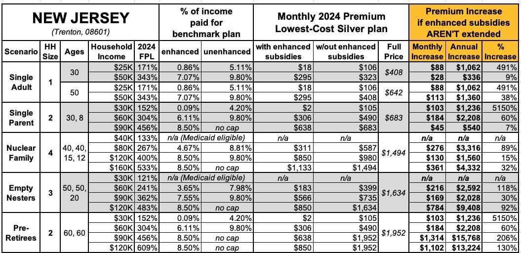 That's the macro level, however. As I did a couple of years ago when the subsidies were originally at risk of expiring in 2023, I decided to run the numbers myself to get an idea of just how much enrollees real-world health insurance premiums would go up in the event the ARPA/IRA subsidies are indeed allowed to expire at the end of next year.