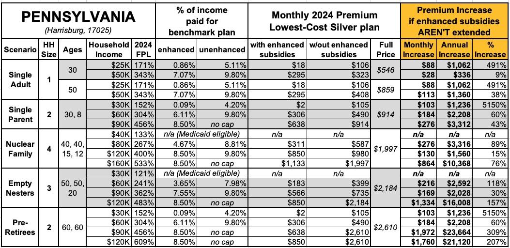 That's the macro level, however. As I did a couple of years ago when the subsidies were originally at risk of expiring in 2023, I decided to run the numbers myself to get an idea of just how much enrollees real-world health insurance premiums would go up in the event the ARPA/IRA subsidies are indeed allowed to expire at the end of next year.