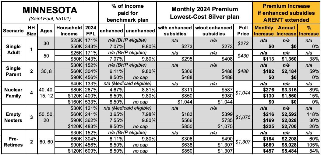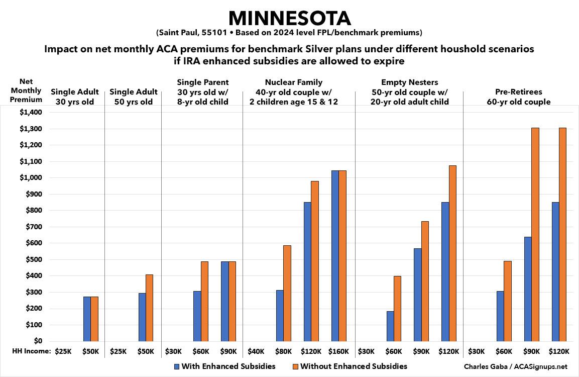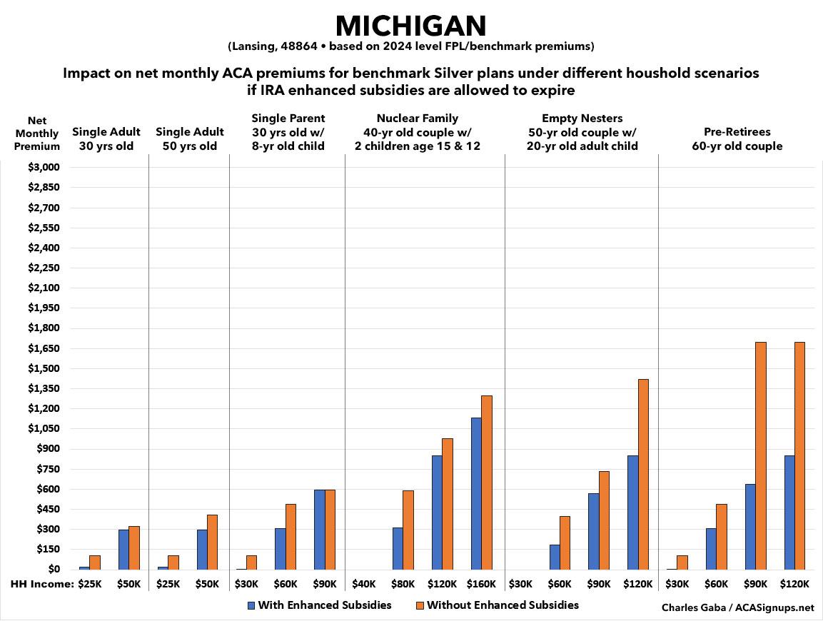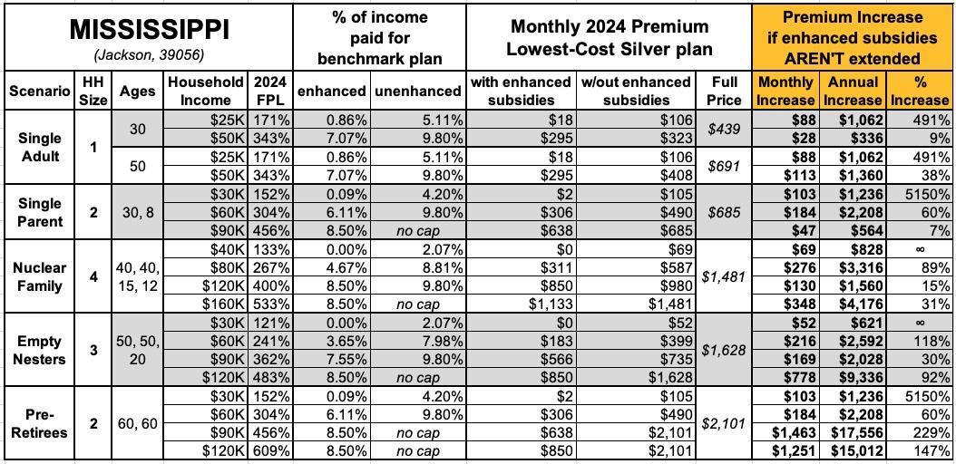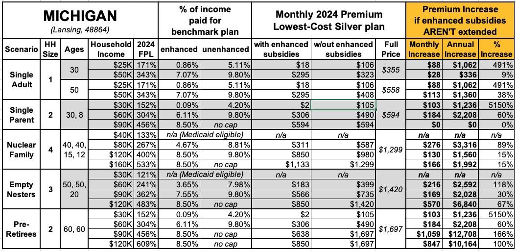 That's the macro level, however. As I did a couple of years ago when the subsidies were originally at risk of expiring in 2023, I decided to run the numbers myself to get an idea of just how much enrollees real-world health insurance premiums would go up in the event the ARPA/IRA subsidies are indeed allowed to expire at the end of next year.