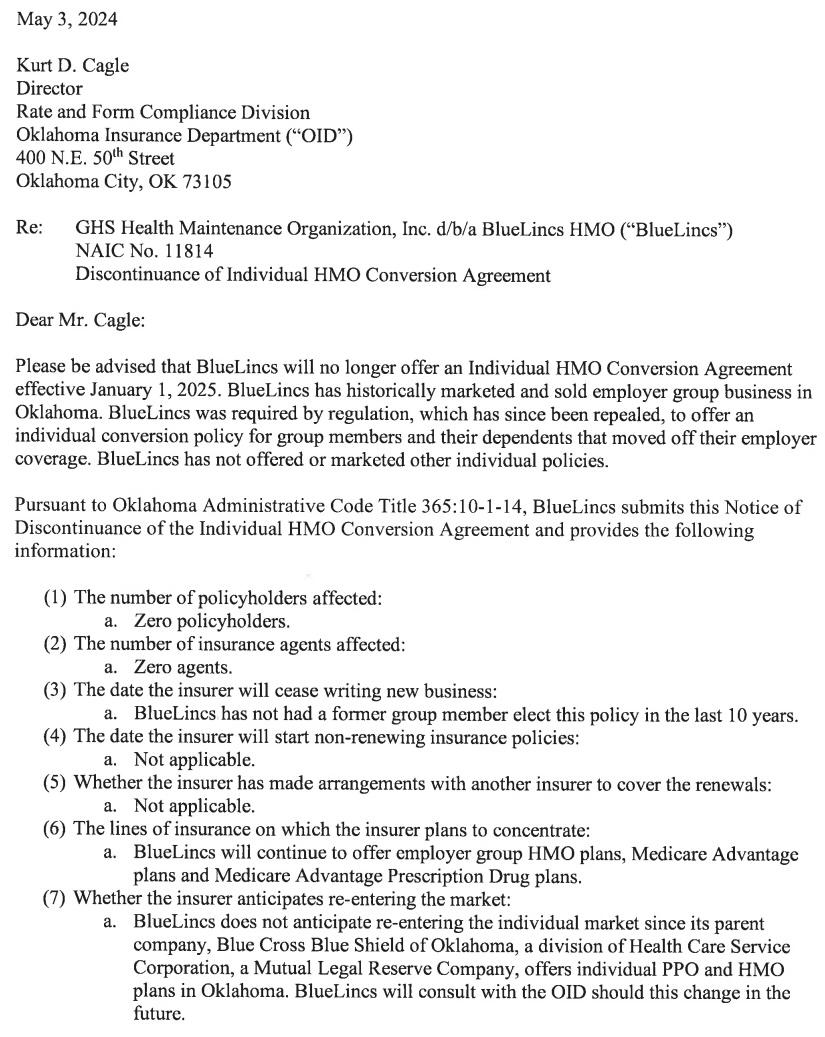It's worth noting that BlueLincs HMO, which was only added to the OK individual market last year, is already being removed from it. In fact, as shown below, it looks like BlueLincs was a special line of policies offered at the point of a regulatory gun; apparently Blue Cross was required to create it as an option for group coverage members who move off of employer coverage. However, that regulation was apparently changed shortly thereafter, and no one ever actually enrolled in a BlueLinc plan anyway, so that's that.