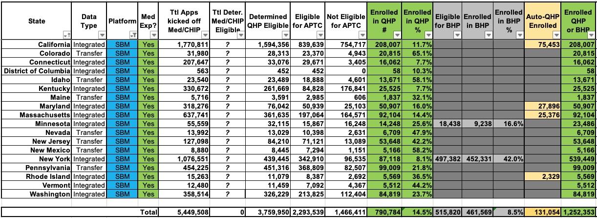 For the 19 SBM states, as of April, 3.47 million had been determined eligible for ACA exchange plans (63% subsidized); of those, 767K actually enrolled in one. Another 472K were eligible for BHP coverage; 425K of those actually signed up.