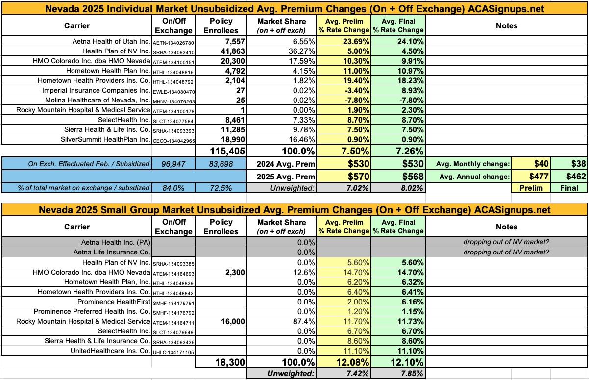 Nevada: *Final* avg. unsubsidized 2025 #ACA rate changes: +7.3% (updated)