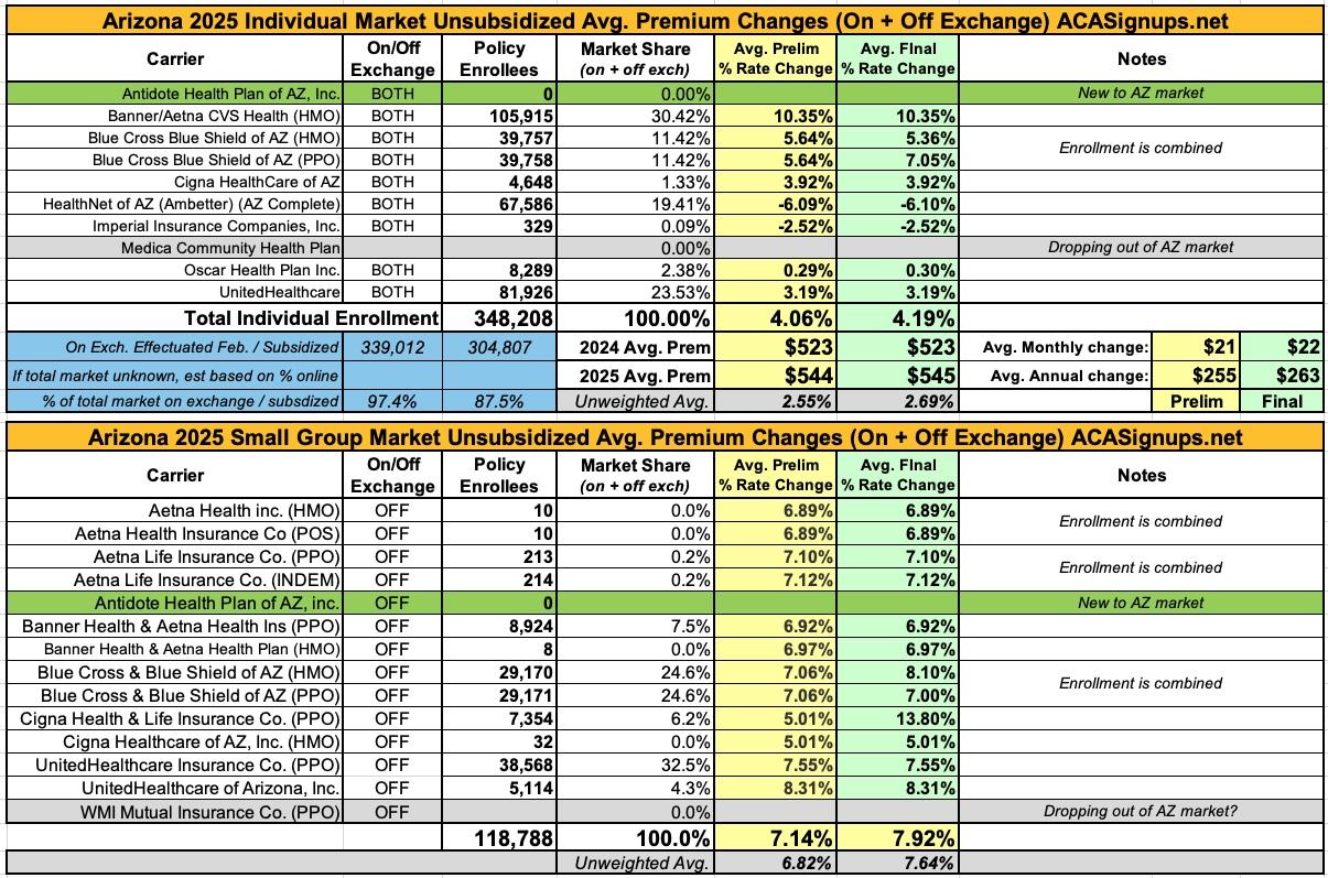 Arizona: *Final* avg. unsubsidized 2025 #ACA rate changes: +4.2% (updated)