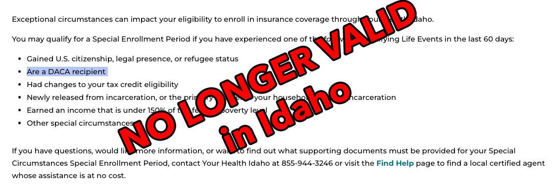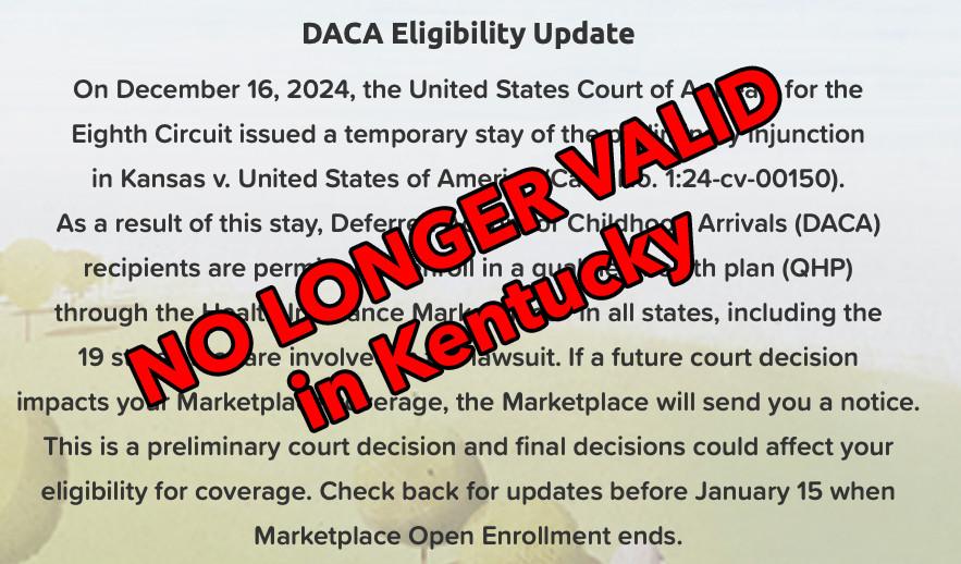 UPDATE 12/27/24: Healthcare.Gov has indeed posted notices all over the website regarding the latest court ruling. Unfortunately, both kynect (Kentucky) and Your Health Idaho still have notices saying DACA recipients are eligible as of this writing, while Virginia's exchange doesn't seem to mention DACA status one way or the other.