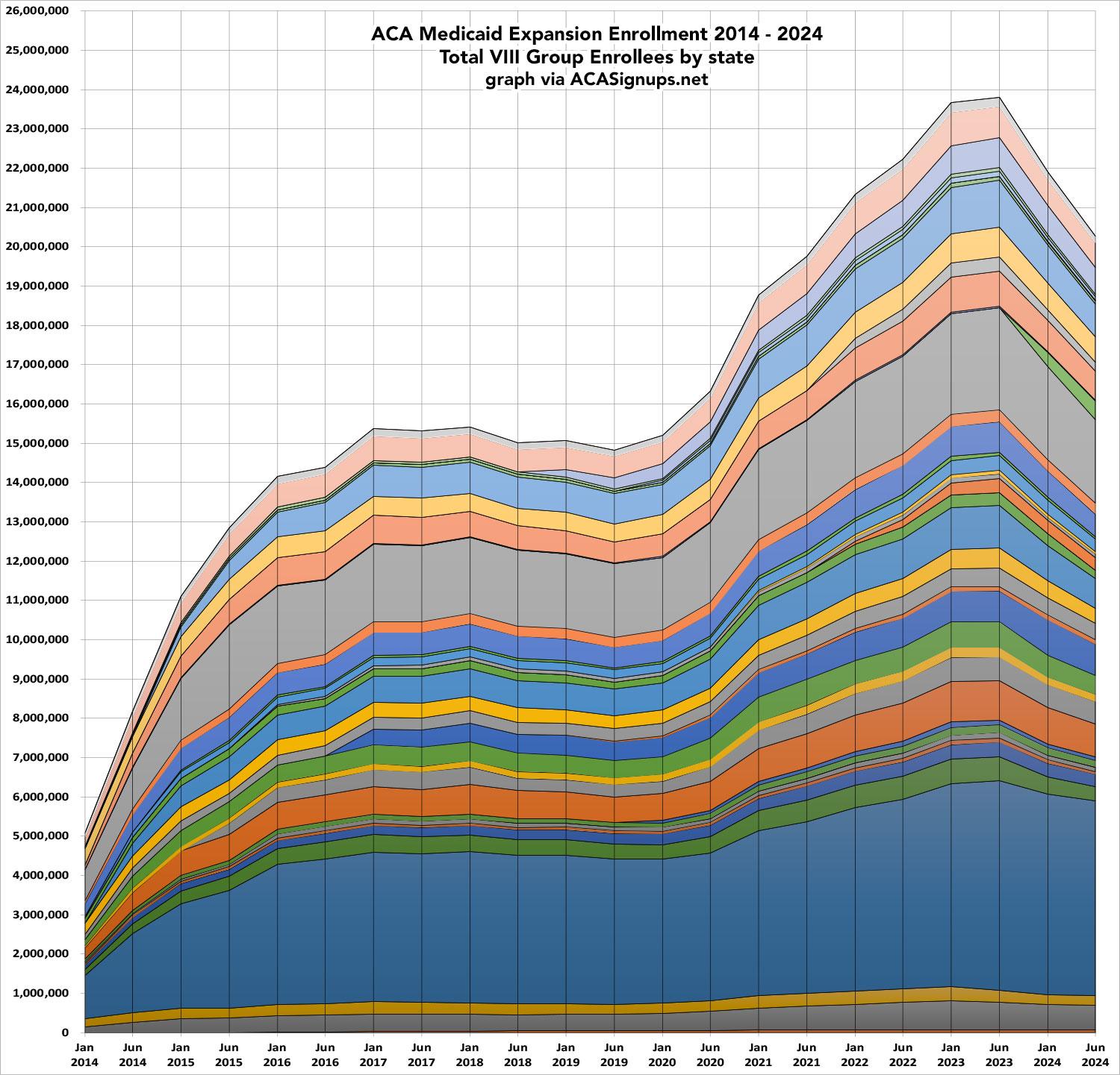 Below I'm posting a similar breakout of total ACA Medicaid Expansion enrollment from January 2014 - June 2024, via the Centers for Medicare & Medicaid Services quarterly Medicaid Budget & Expenditure System reports (warning: That link could be broken or blank by the time you read this under the Trump Administration).