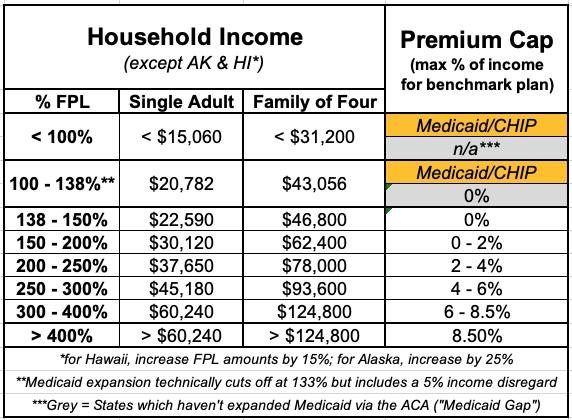 Prior to the American Rescue Plan/Inflation Reduction Act, ACA subsidies were limited (on a sliding income scale) to enrollees earning between 100 - 400% FPL (roughly $60,000/year for one person or $125,000/year for a family of four). If you earned more than 400% FPL, however, you had to pay full price no matter how expensive the premiums were.