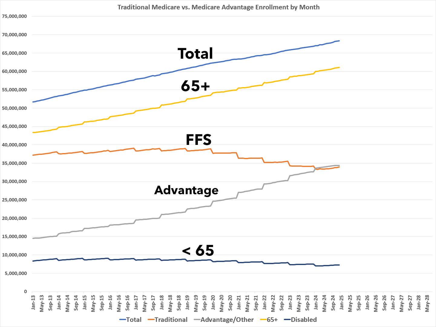 At first glance, the only thing which surprises me here is that traditional (FFS) Medicare grew substantially more than Medicare Advantage for the second month in a row, which is interesting given the steady trend of Advantage plans gaining market share for years. MA is still over the 50% threshold, however, at 50.3% of total Medicare enrollment.