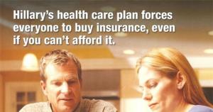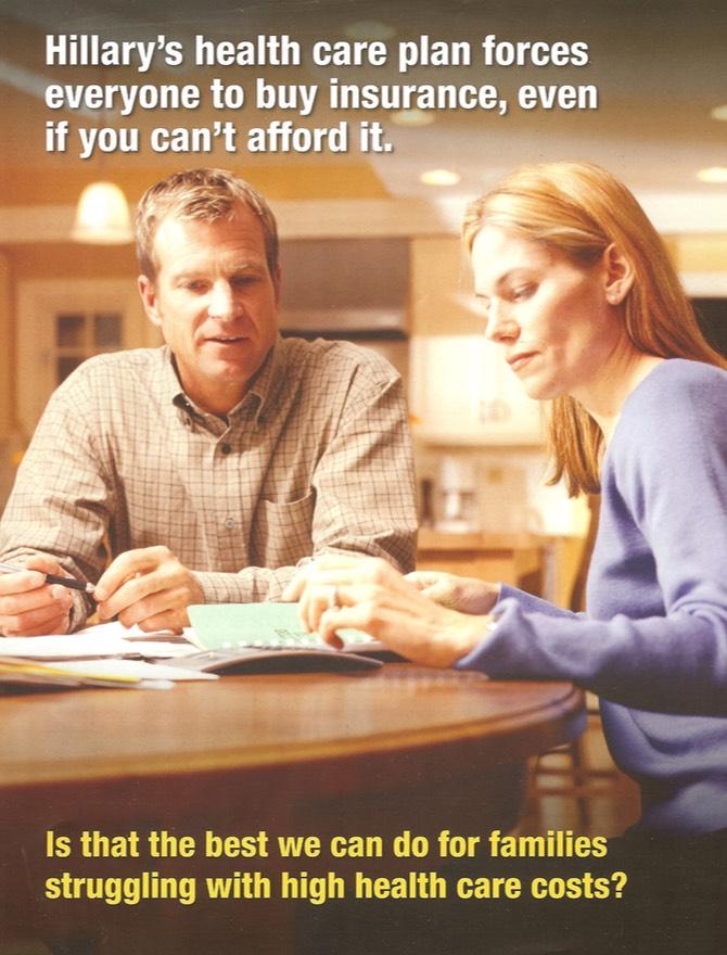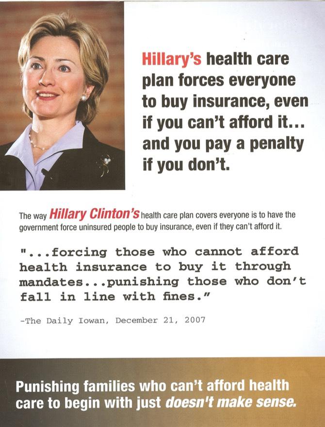 Second, the "...even if you can't afford it" slam is included no fewer than five times. I'm pretty sure Hillary's 2008 primary campaign proposal included some sort of affordability waiver (the final version of the ACA lets you off the hook if the lowest-price ACA-compliant policy costs more than 8.3% of your household income), in which case the "even if you can't afford it" attack was either false or at least disingenuous depending on your point of view. I don't recall the exact details of Hillary's 2008 proposal, however, so it's possible that it didn't include such a waiver (or if it did, that it was set at a higher threshold than Obama's).