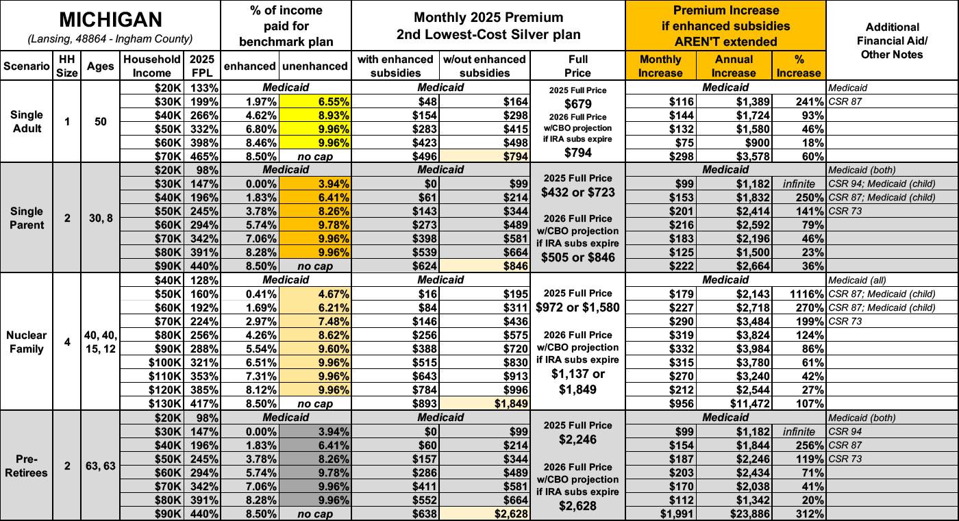 Here's the revised/updated table looks like for all four households. Remember, this also assumes that the benchmark Silver plan in Lansing, Michigan increases by 17% instead of 4.3%: