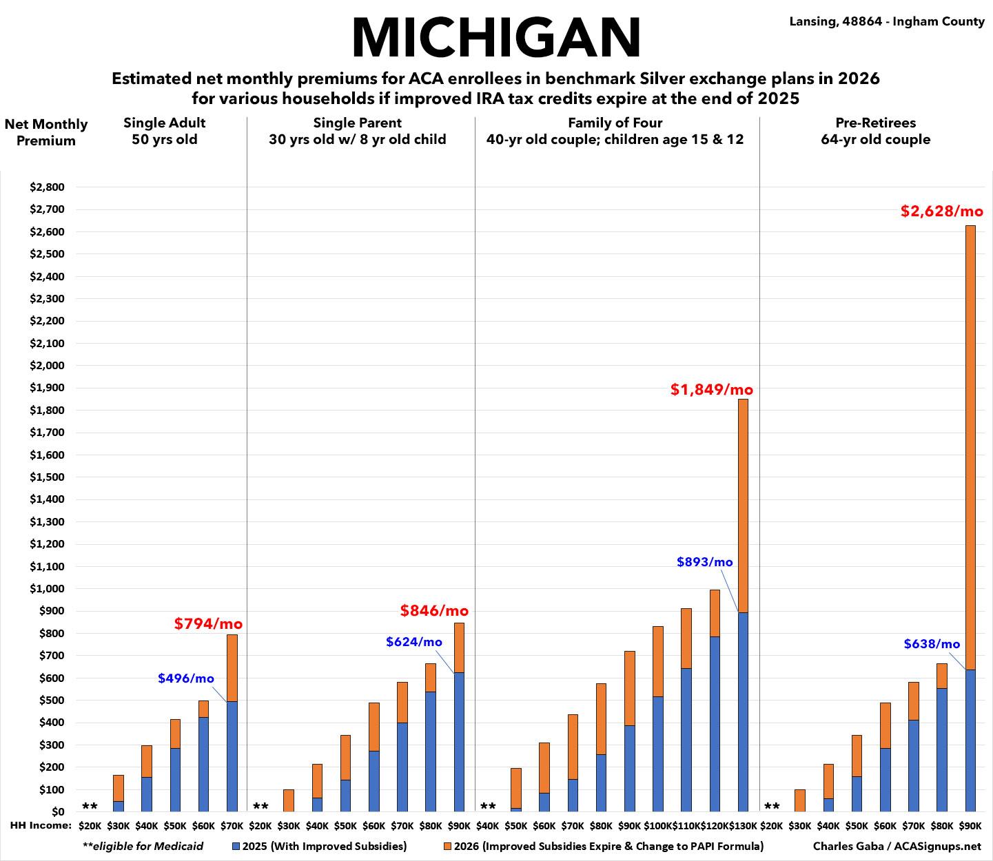As for claiming that it's an "exaggeration" that "families will have to pay significantly more for their health insurance" or "could even lose coverage altogether," he might want to take a gander at how much net premiums are expected to increase for current ACA enrollees. Seriously, pick a state, any state. Here's my home state of Michigan, for example: