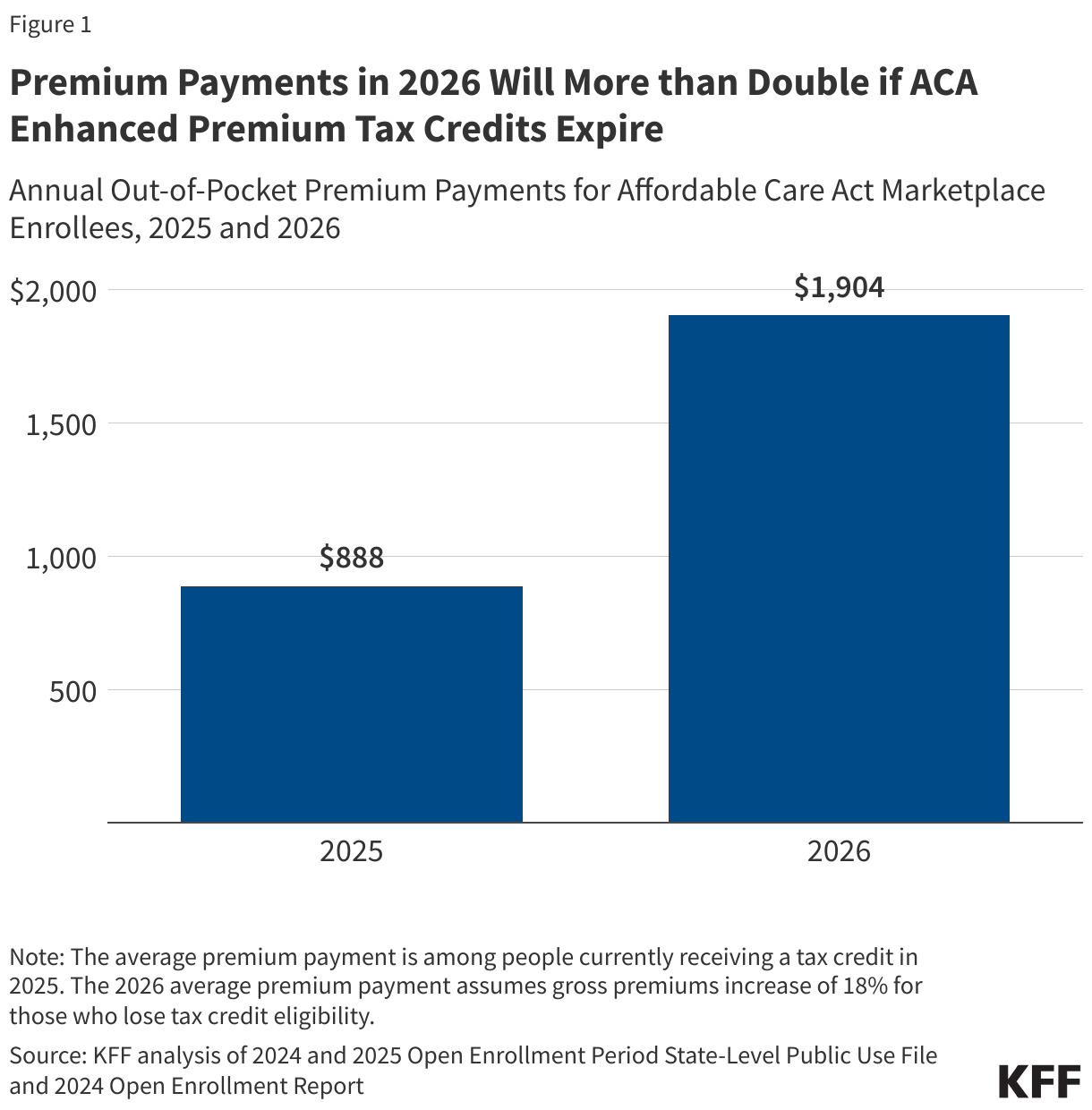 Based on the earlier federal data and more recent other publicly available information, KFF now estimates that, if Congress extends enhanced premium tax credits, subsidized enrollees would save $1,016 in premium payments over the year in 2026 on average. In other words, expiration of the enhanced premium tax credits is estimated to more than double what subsidized enrollees currently pay annually for premiums—a 114% increase from an average of $888 in 2025 to $1,904 in 2026. (The average premium payment net of tax credits among subsidized enrollees held steady at $888 annually in 2024 and 2025 due to the enhanced premium tax credits).