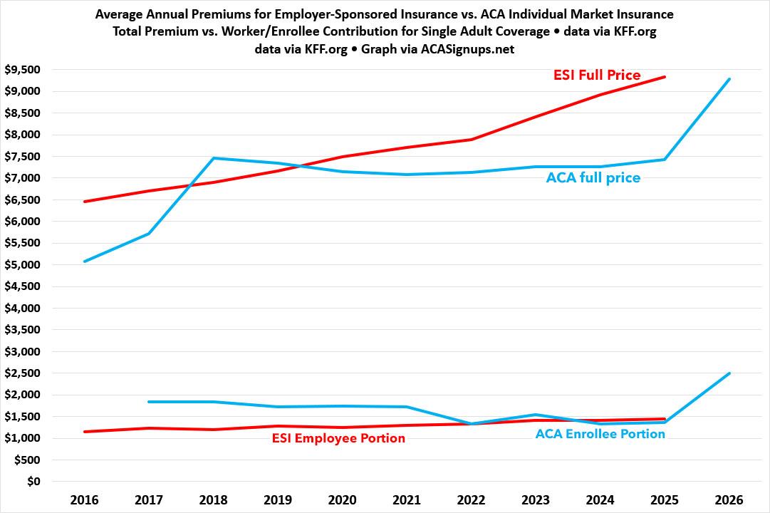 Interestingly, even that 25% average gross increase will still leave full-price ACA premiums slightly lower ($9,288/yr) than avg. full-price ESI premiums ($9,235)...and that's before whatever the 2026 ESI increases bring.