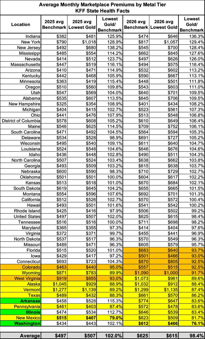 For instance, in my home state of Michigan, the average benchmark Silver plan costs $404/mo this year, while the lowest-cost Gold plan averages slightly higher at $415/mo. For 2026, these are both going up significantly: The benchmark will be $523 while the lowest Gold will be $561. Since Michigan is not, unfortunately, among the states which has implemented PA, this makes sense.