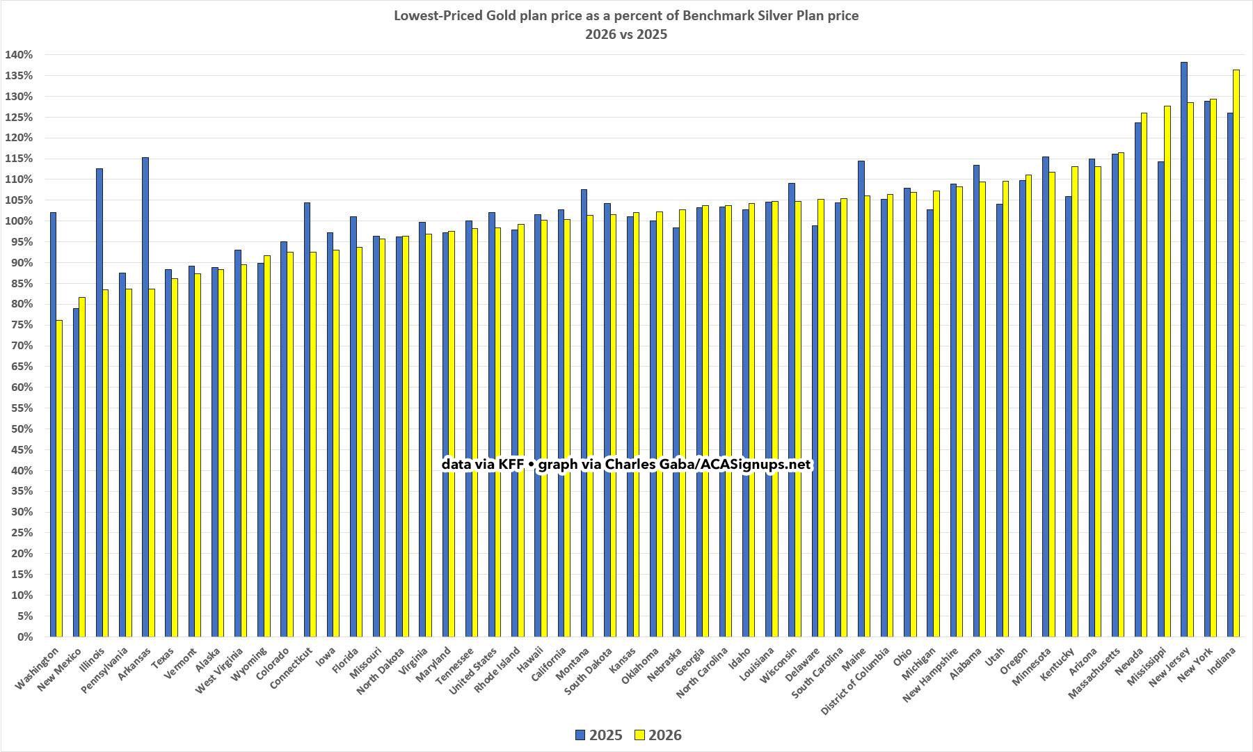 As you can see, Washington, Illinois and Arkansas (bold, in green) show a huge change year over year: All three went from Gold costing more than Silver to Gold dropping well below the benchmark plan, ranging from 16 - 24% lower.