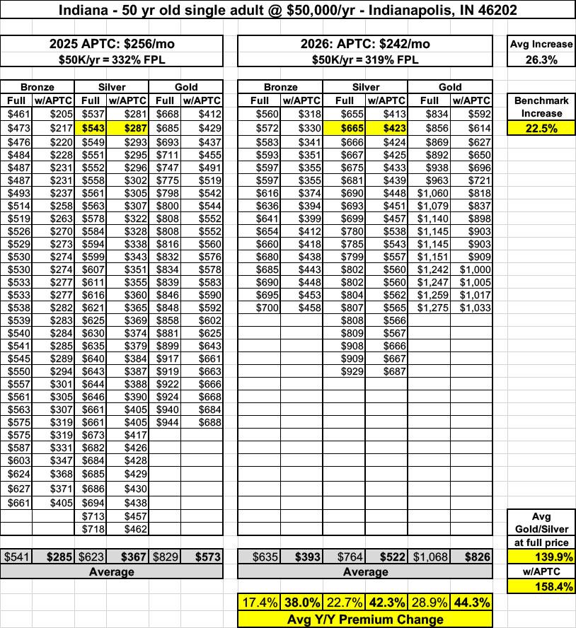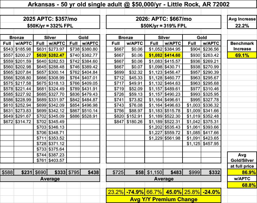First, the ground rules: Since those who earn less than 200% FPL are usually better off with Silver plans and those who earn over 400% FPL aren't going to be eligible for APTC subsidies at all starting in January, for all examples I'm using a 50-yr old single adult who earns $50,000/year, which is 332% FPL in 2025 and 319% FPL in 2026.