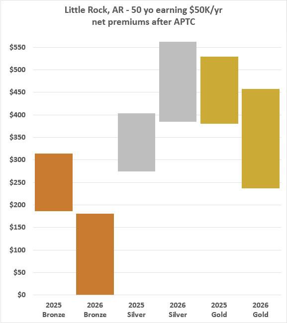 In this case the increase in net pricing from 2025 to 2026 is pretty much entirely due to the expiring tax credits: If 2026 pricing was identical but the enhanced APTC formula was still in place, the enrollee would be eligible for an additional $131/mo in APTC, which would save him an additional $1,572 for the year. This would have knocked the Gold plans down to as low as $217/month. Unfortunately, they'll have to settle for paying as little as $348/mo, which is still $43 less than the least-expensive Silver plan.