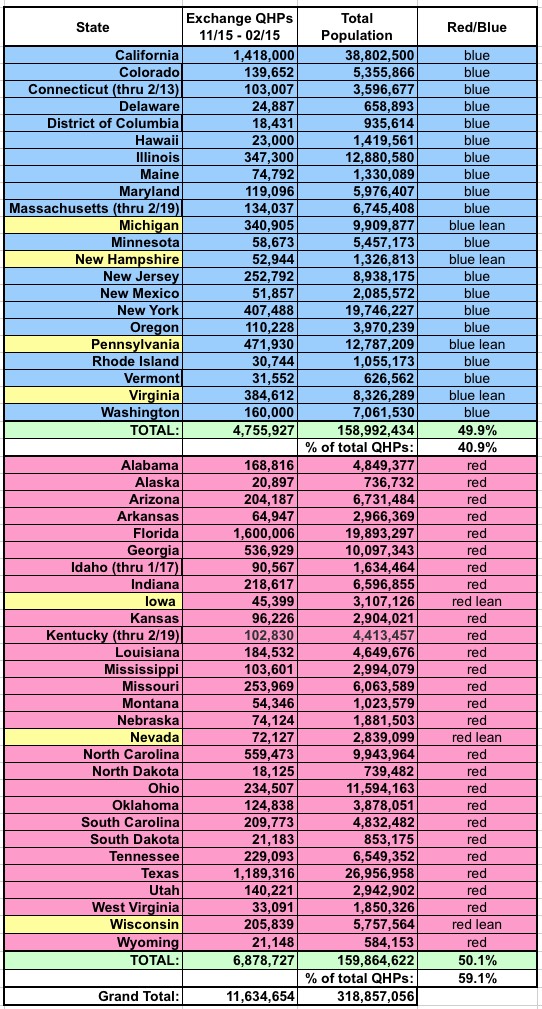 Add them all up and you get 288,568 new enrollees for 2015. Add those to the 944K (minimum) renewals from 2014 and you get 1,232,568 or more through Feb. 2nd.