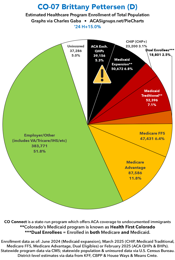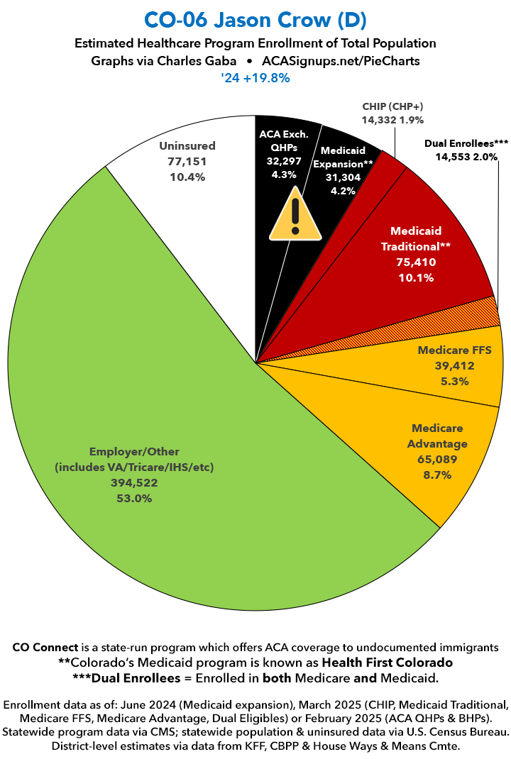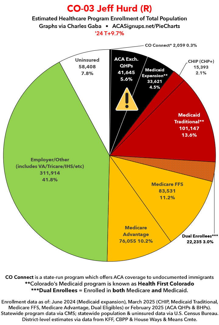 UPDATE 7/2/25: I've updated the web versions of the graphics with the most up-to-date enrollment data I have access to. The black sections w/the ⚠️ symbol are those most at risk of losing healthcare coverage due to H.R. 1, the "One Big Beautiful Bill Act" (aka the #MAGAMurderBill).