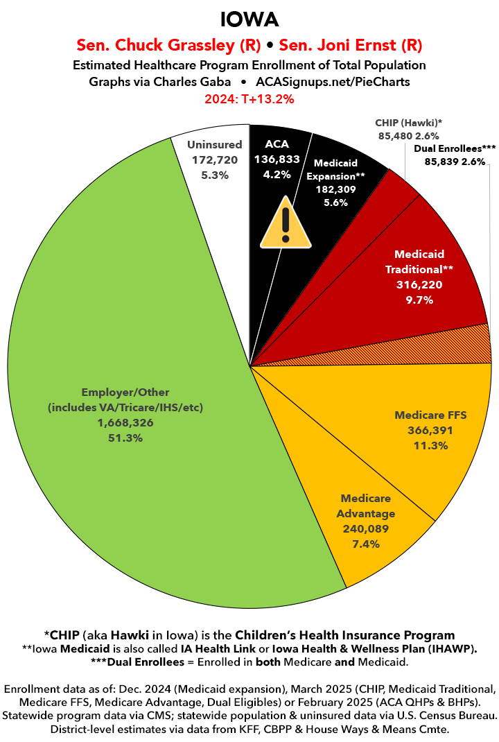 UPDATE 7/4/25: I've updated the web versions of the graphics with the most up-to-date enrollment data I have access to. The black sections w/the ⚠️ symbol are those most at risk of losing healthcare coverage due to H.R. 1, the "One Big Beautiful Bill Act" (aka the #MAGAMurderBill).