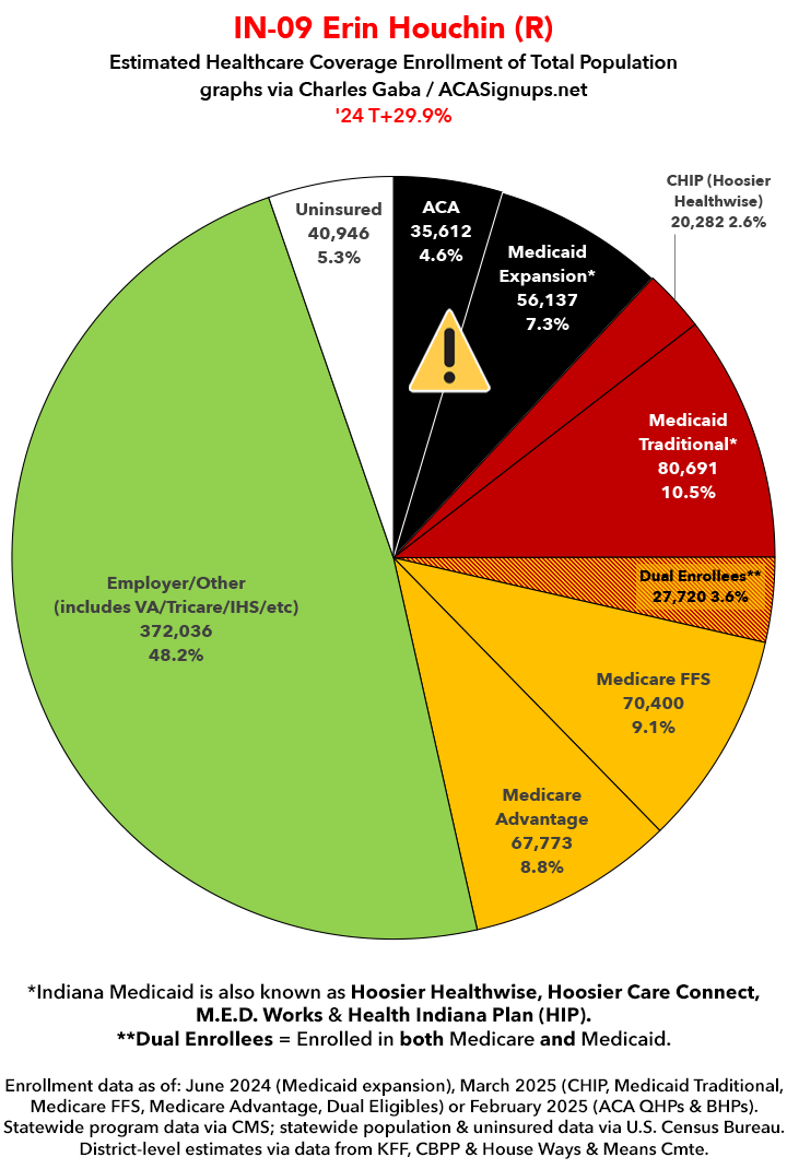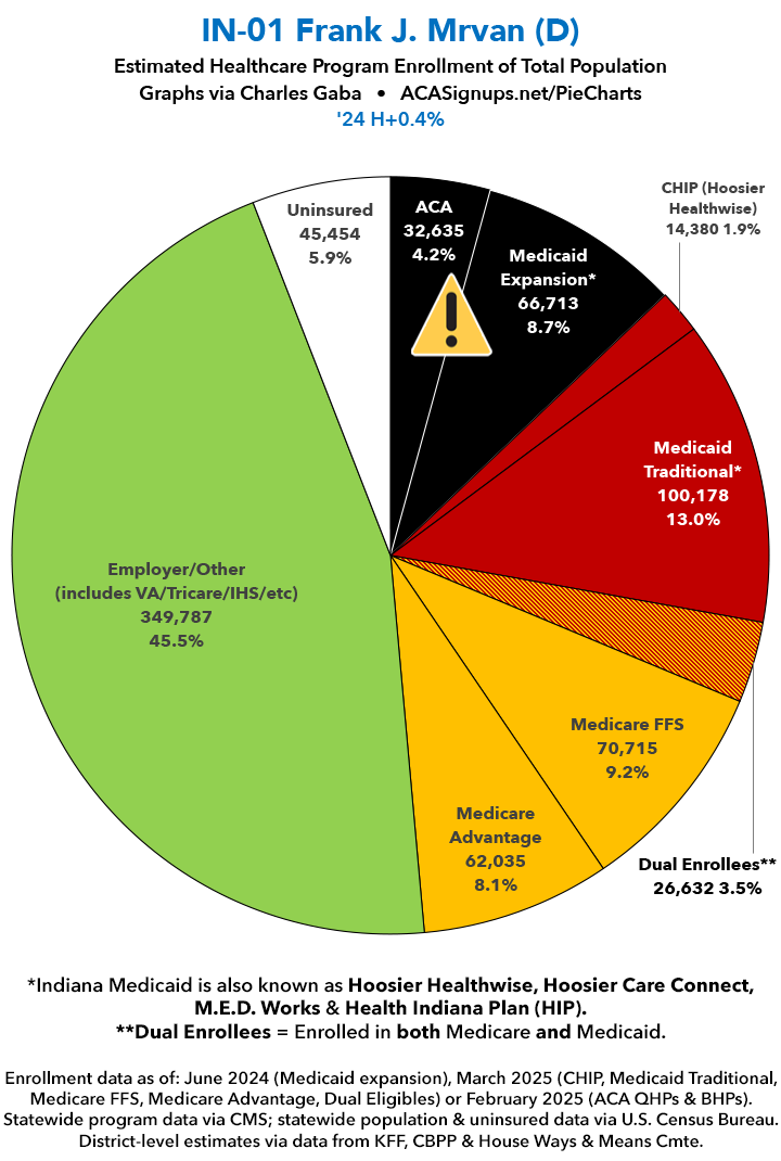 UPDATE 7/3/25: I've updated the web versions of the graphics with the most up-to-date enrollment data I have access to. The black sections w/the ⚠️ symbol are those most at risk of losing healthcare coverage due to H.R. 1, the "One Big Beautiful Bill Act" (aka the #MAGAMurderBill).