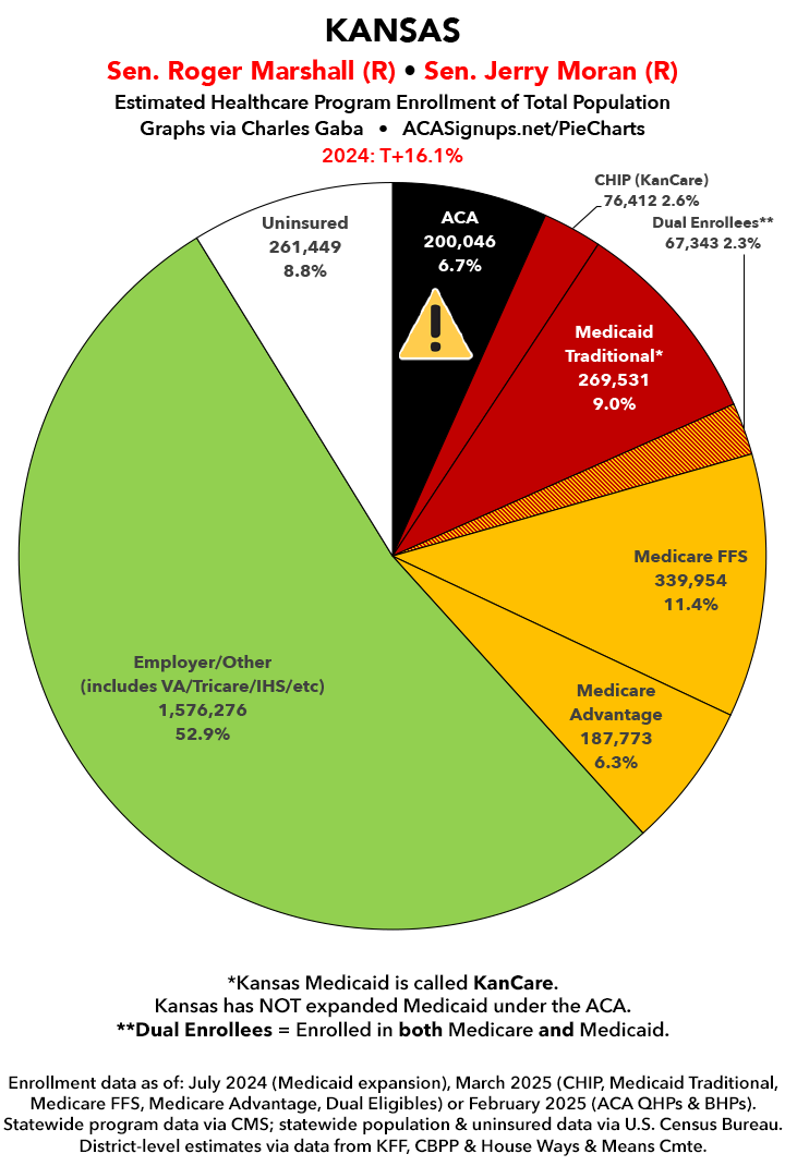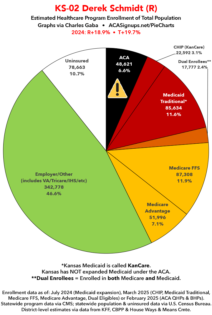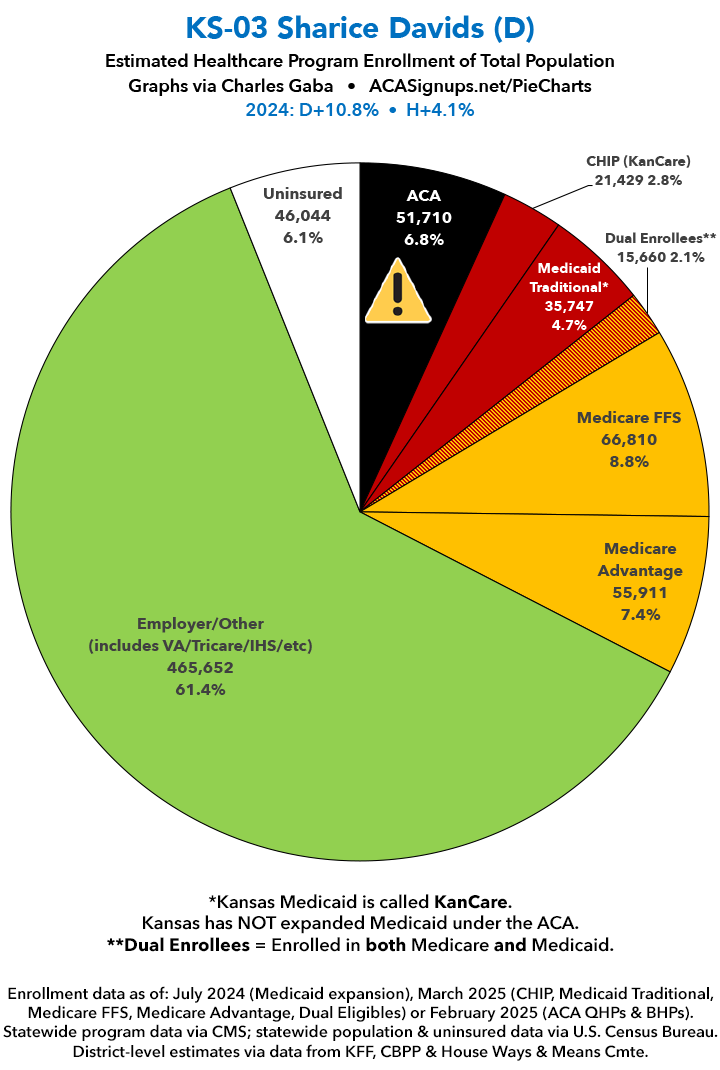 UPDATE 7/4/25: I've updated the web versions of the graphics with the most up-to-date enrollment data I have access to. The black sections w/the ⚠️ symbol are those most at risk of losing healthcare coverage due to H.R. 1, the "One Big Beautiful Bill Act" (aka the #MAGAMurderBill).