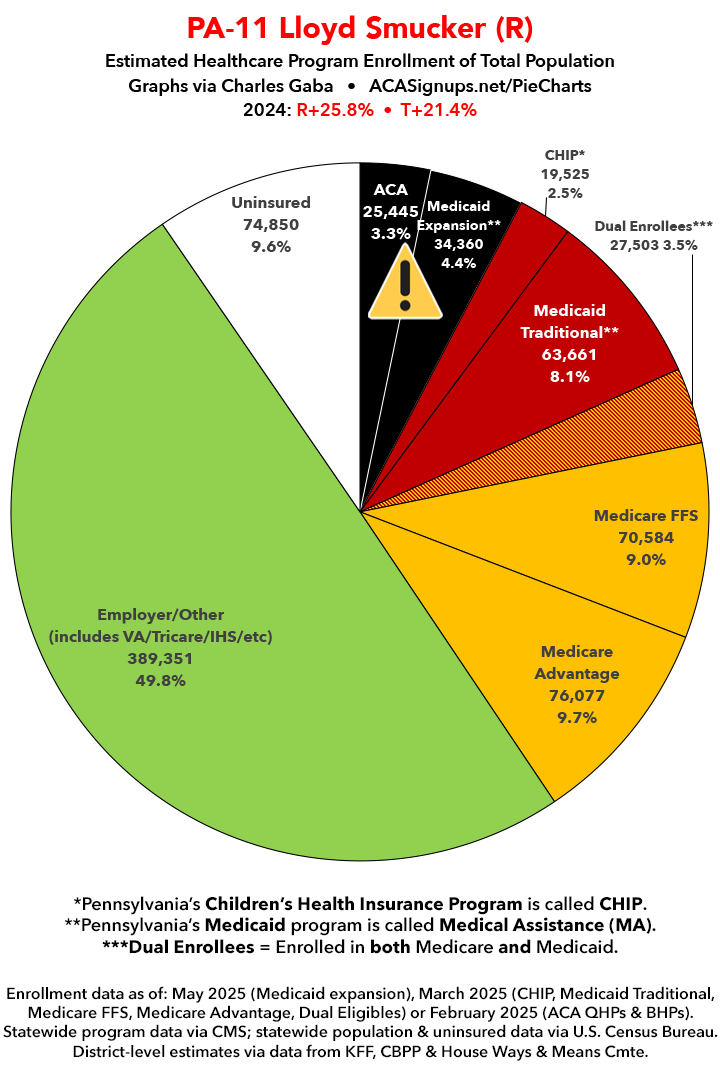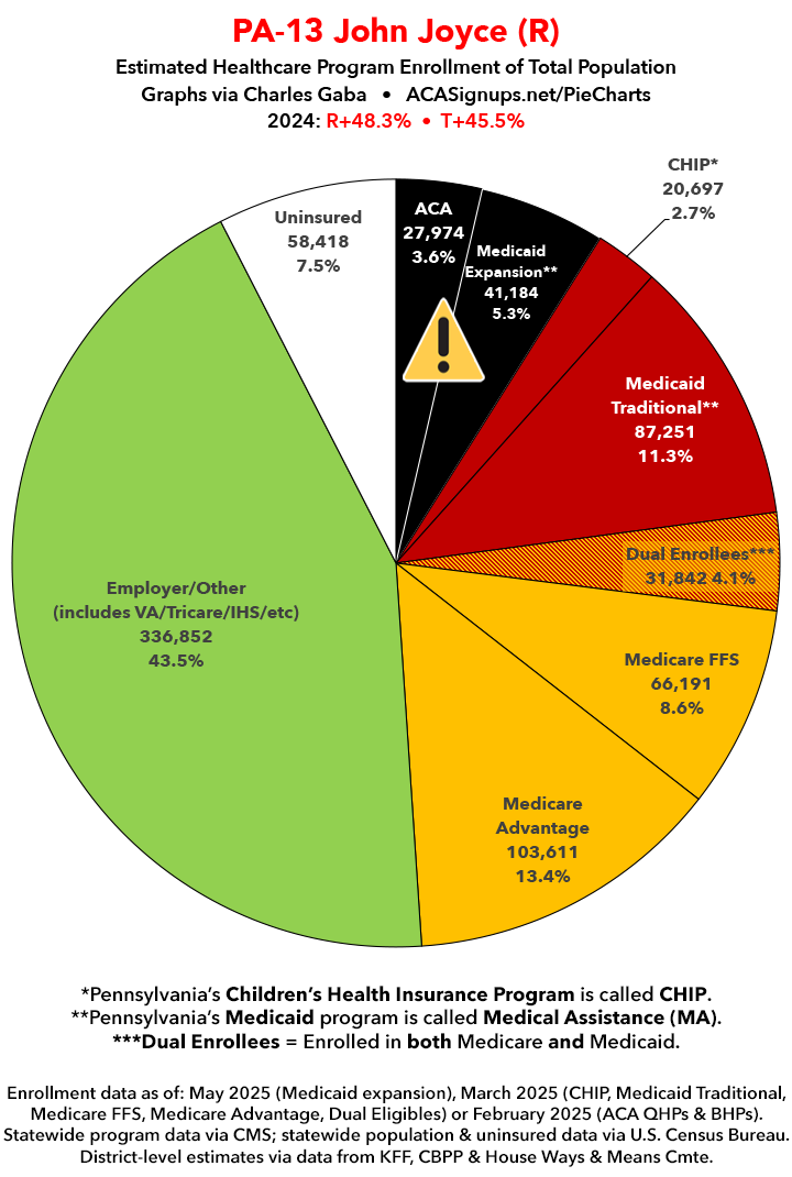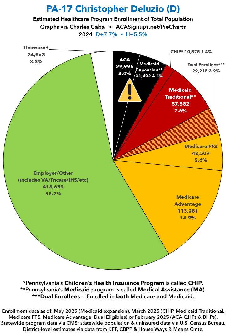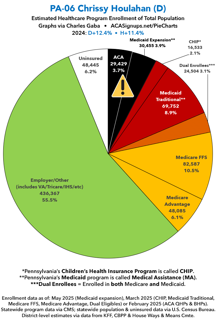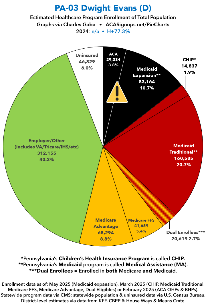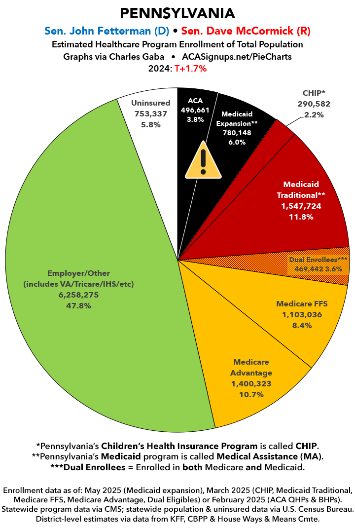 UPDATE 7/11/25: I've updated the web versions of the graphics with the most up-to-date enrollment data I have access to. The black sections w/the ⚠️ symbol are those most at risk of losing healthcare coverage due to H.R. 1, the "One Big Beautiful Bill Act" (aka the #MAGAMurderBill).