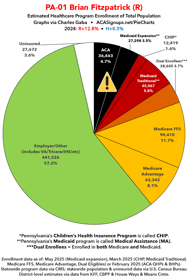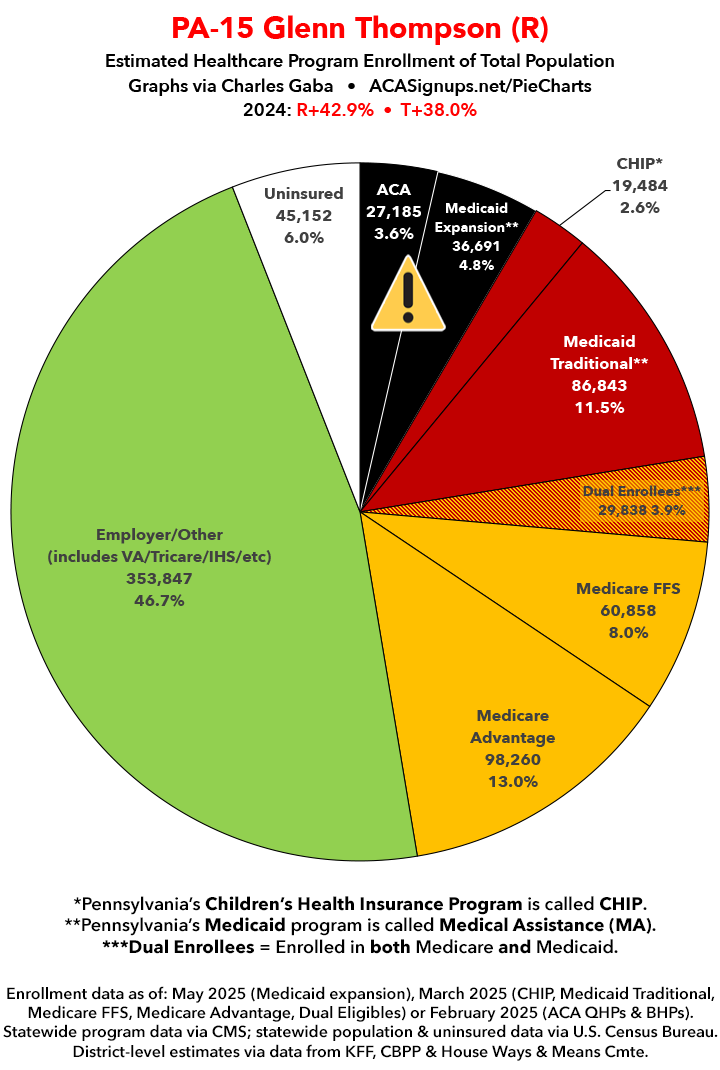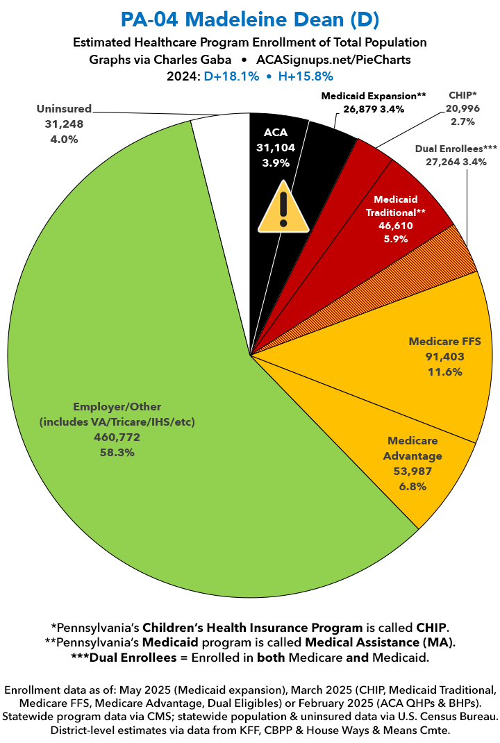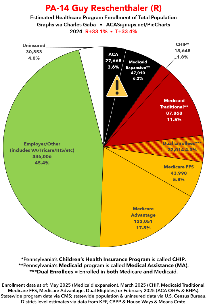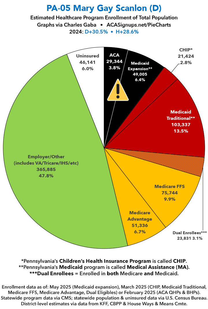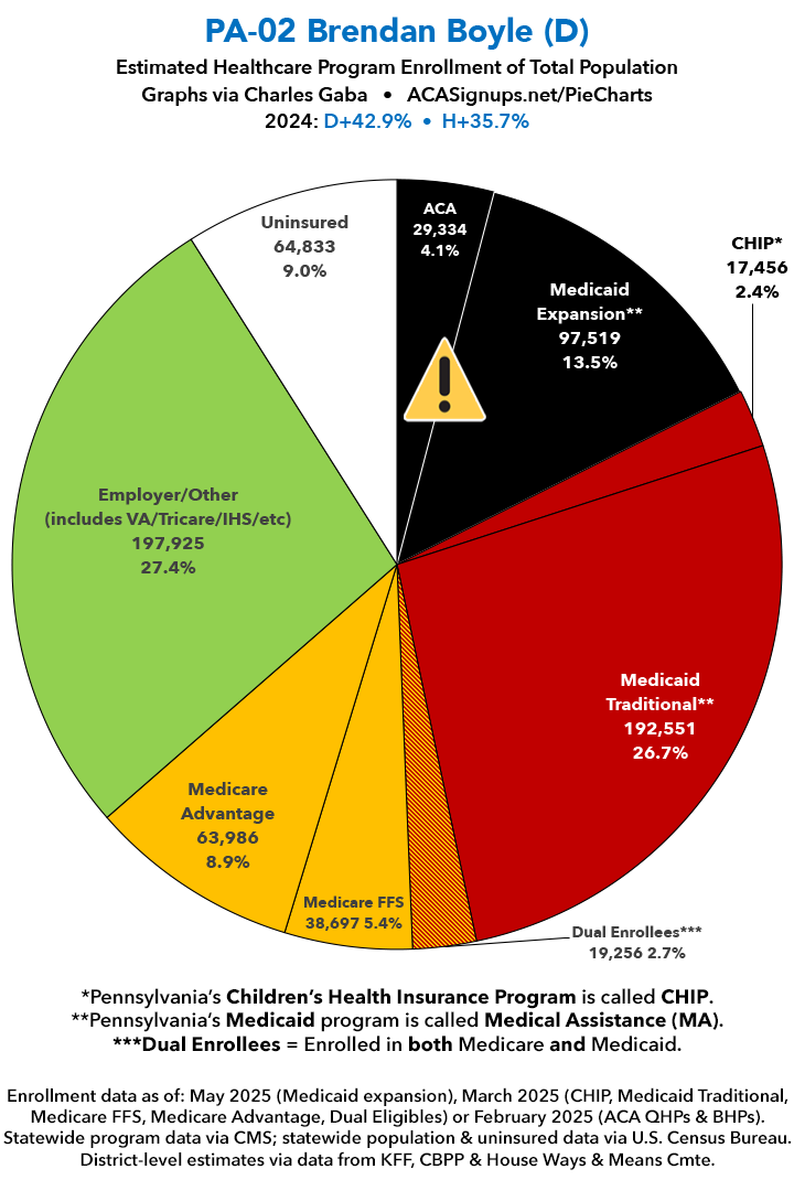 UPDATE 7/11/25: I've updated the web versions of the graphics with the most up-to-date enrollment data I have access to. The black sections w/the ⚠️ symbol are those most at risk of losing healthcare coverage due to H.R. 1, the "One Big Beautiful Bill Act" (aka the #MAGAMurderBill).