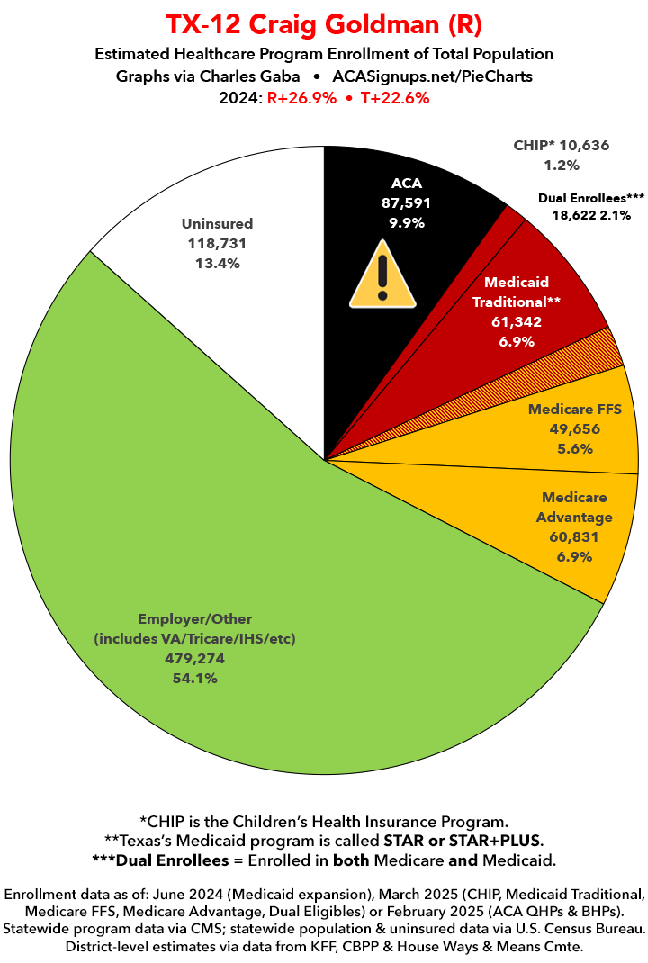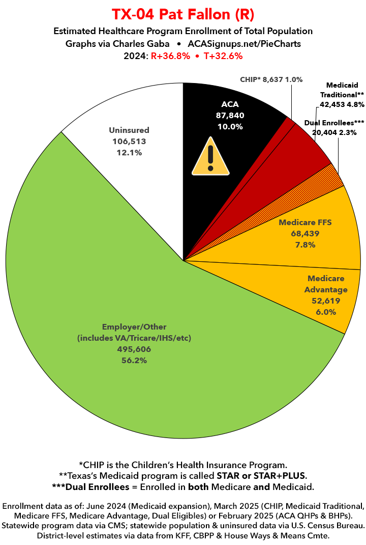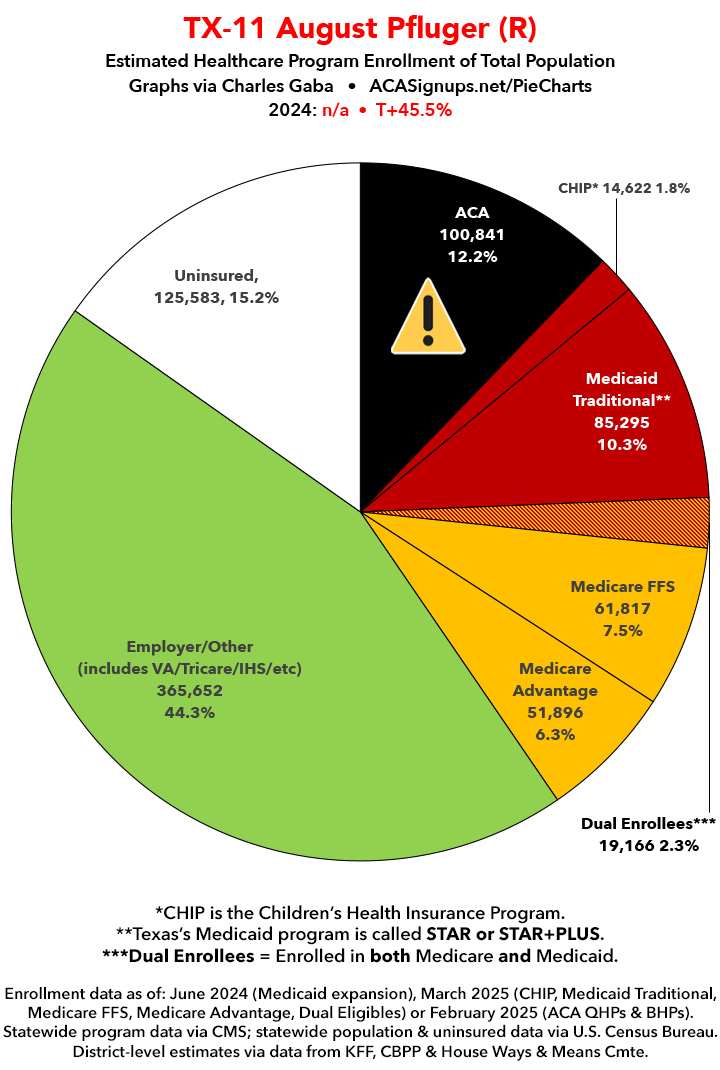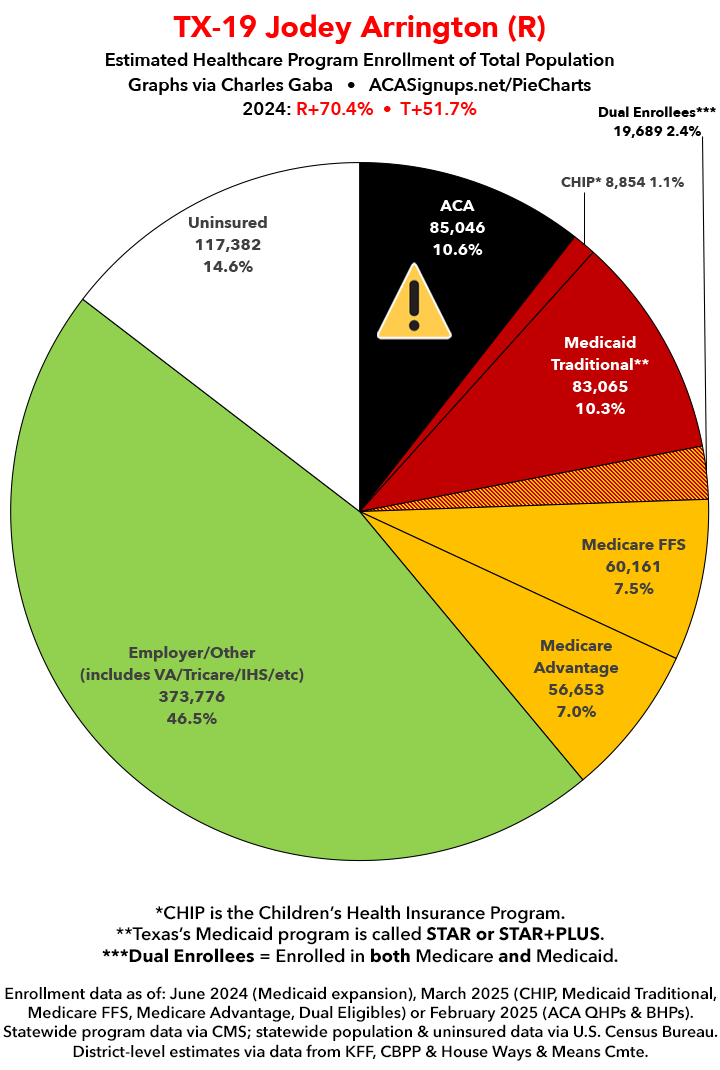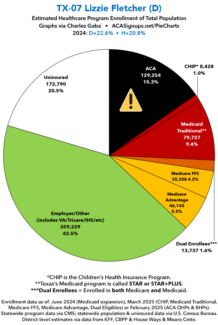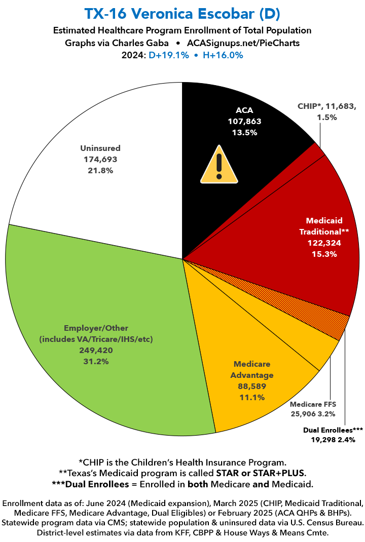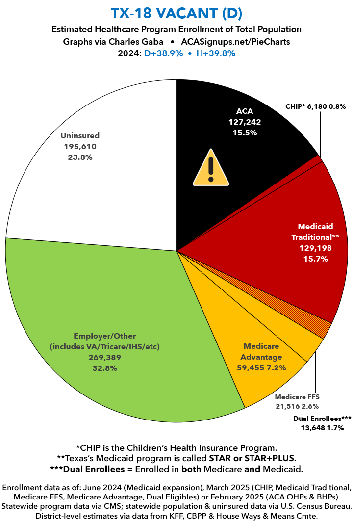 UPDATE 7/13/25: I've updated the web versions of the graphics with the most up-to-date enrollment data I have access to. The black sections w/the ⚠️ symbol are those most at risk of losing healthcare coverage due to H.R. 1, the "One Big Beautiful Bill Act" (aka the #MAGAMurderBill).