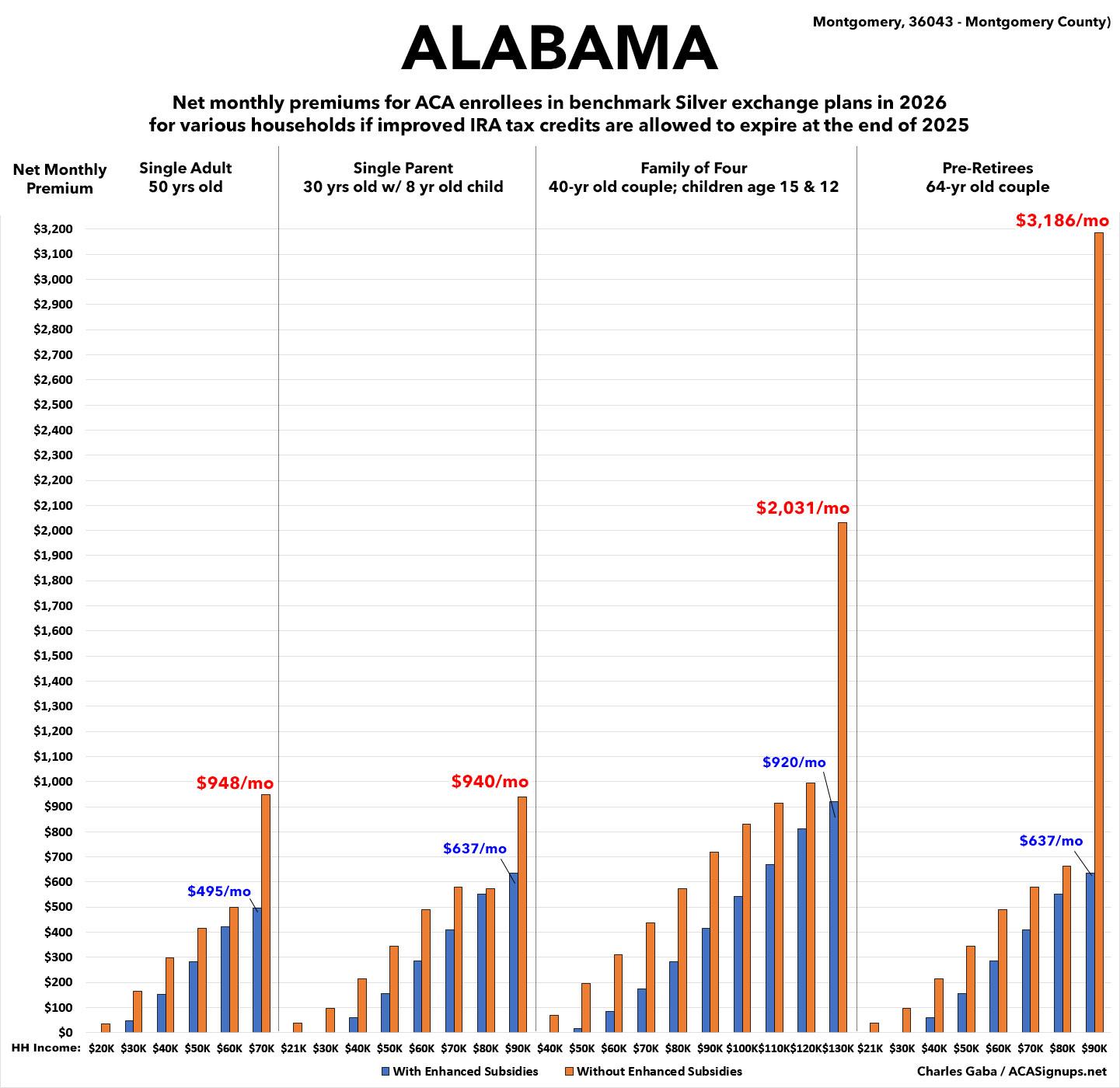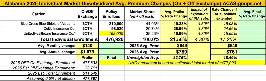 NEW: The original version of this analysis included a 4.3% increase in the unsubsidized benchmark plan premium based on a projection by the Congressional Budget Office. However, that was a national average projection which didn’t take into account other factors like increased utilization, medical inflation and so on. This updated version assumes the actual 2026 Alabama rate filings which average 21.7% statewide.