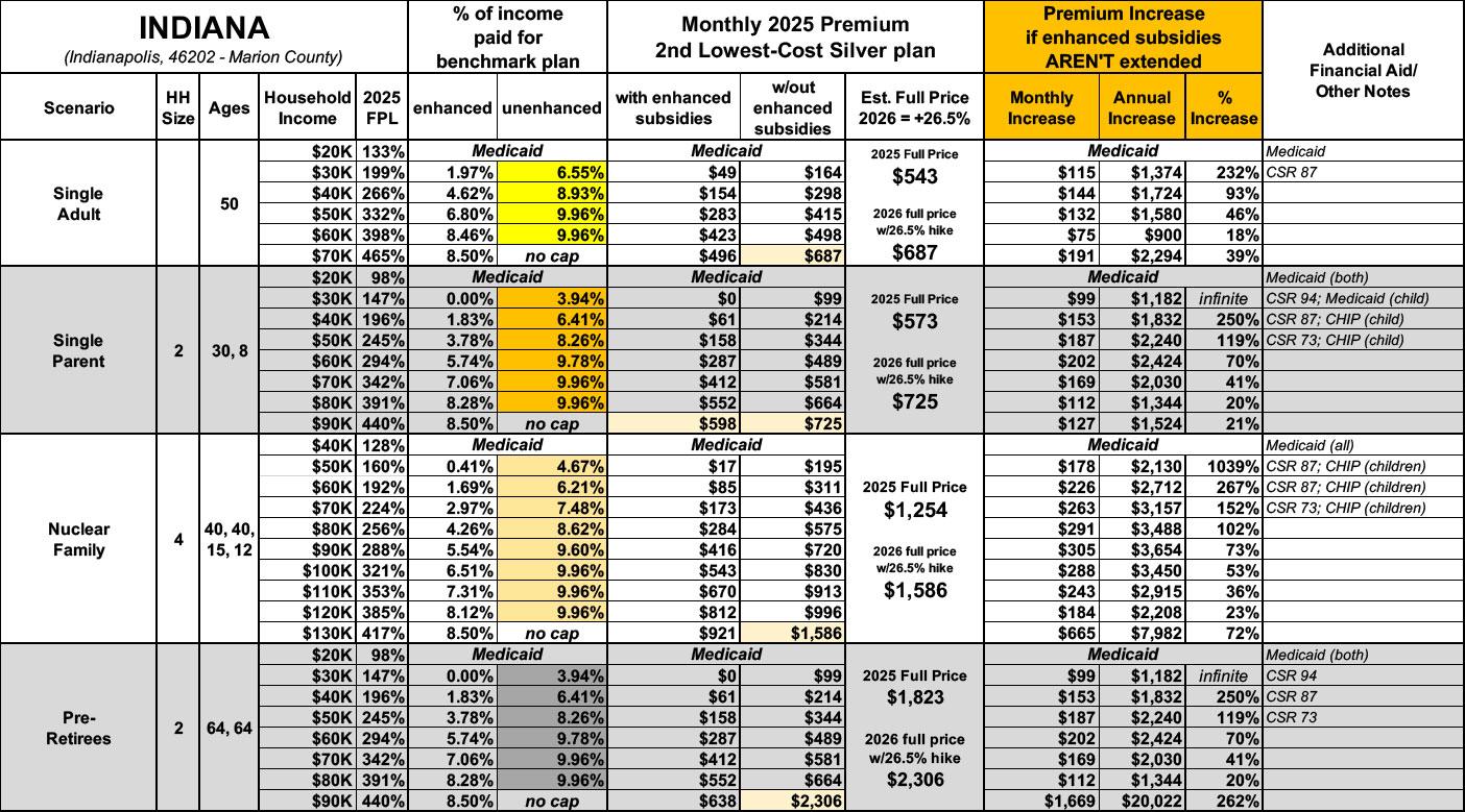 NEW: The original version of this analysis included a 4.3% increase in the unsubsidized benchmark plan premium based on a projection by the Congressional Budget Office. However, that was a national average projection which didn’t take into account other factors like increased utilization, medical inflation and so on. This updated version assumes the actual 2026 Indiana rate filings which average 26.5% statewide.