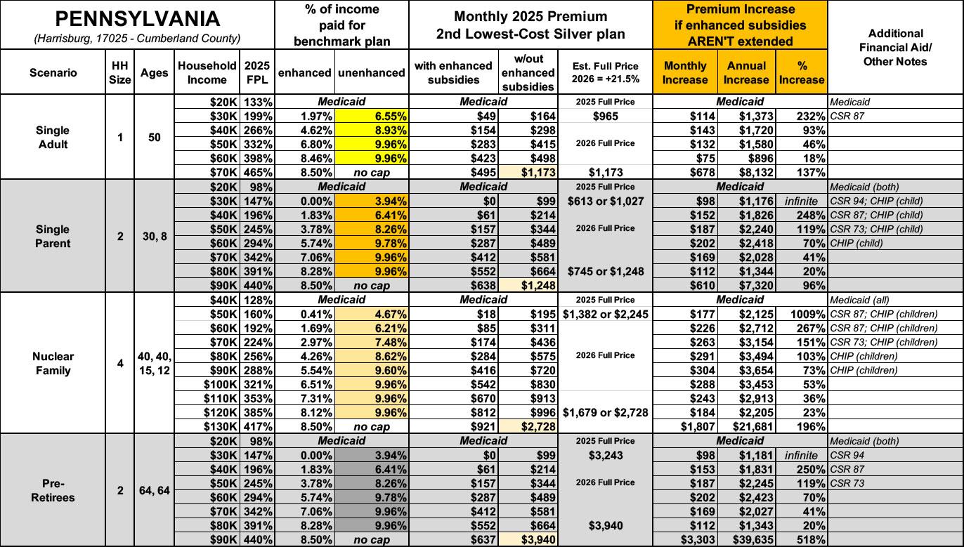 Pennsylvania has around ~496,000 residents enrolled in ACA exchange plans, 87% of whom are currently subsidized. I estimate they also have another ~103,000 unsubsidized off-exchange enrollees.