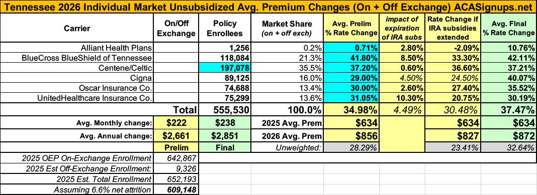 In Tennessee specifically, all of this will result in average gross premiums hikes of 37.5%.