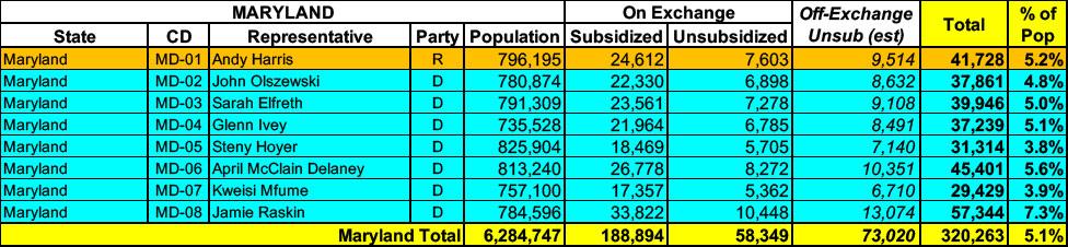 Maryland has around 247,000 residents enrolled in ACA exchange plans, 76% of whom are currently subsidized. I estimate they also have another ~73,000 unsubsidized off-exchange enrollees.