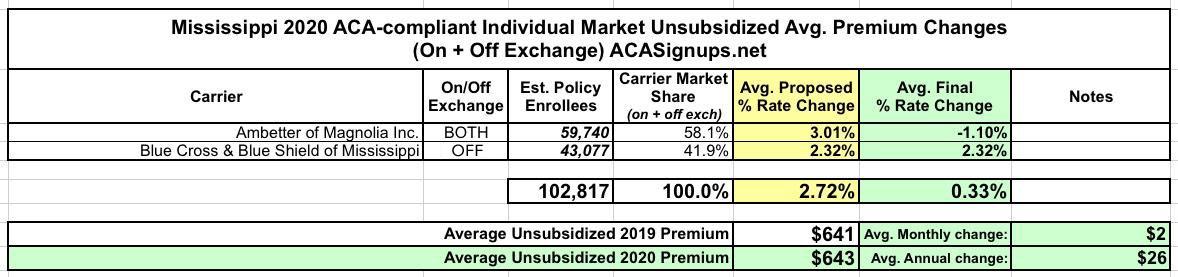 Mississippi once again has two carriers offering ACA-compliant individual market coverage in 2020: Ambetter of Magnolia, which holds 58% of the market, and Blue Cross Blue Shield with the other 42%. Earlier this year they were asking for average rate hikes of 3.0% and 2.3% respectively, but Ambetter's final/approved rates are coming in at a 1.1% reduction, bringing the overall average down to a mere 0.3% rate hike.