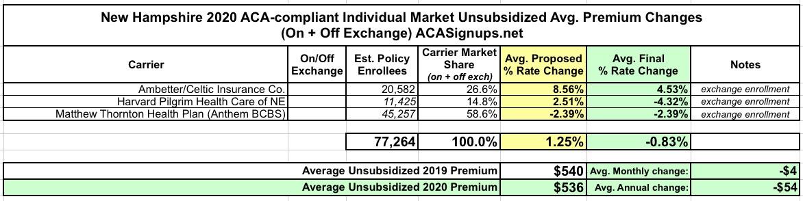 Back in early August, it looked like New Hampshire's avg. unsubsidized 2020 ACA premiums would be increasing slightly, by a little over 1% statewide.