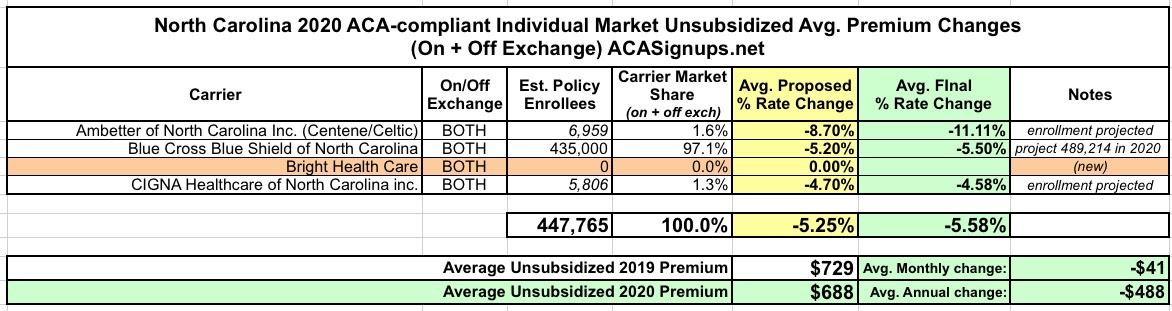 North Carolina has three individual market carriers in 2019. For 2020, that's increasing to four, as Bright Health Care is expanding into the NC market. The other three carriers (Blue Cross Blue Shield has a near monopoly at the moment) had requested average unsubsidized rate drops of 5.3% previously; in the end the final rates are dropping slightly more, to -5.6%.