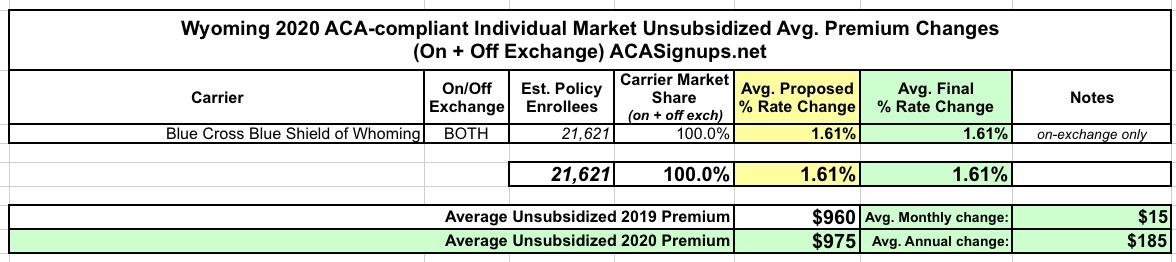 Not much to this one: Wyoming has just a single carrier selling ACA-compliant individual market policies to their 577,000 residents, Blue Cross Blue Shield...which is raising rates 1.6% on average for 2020. No change from their requested increase a few months earlier.
